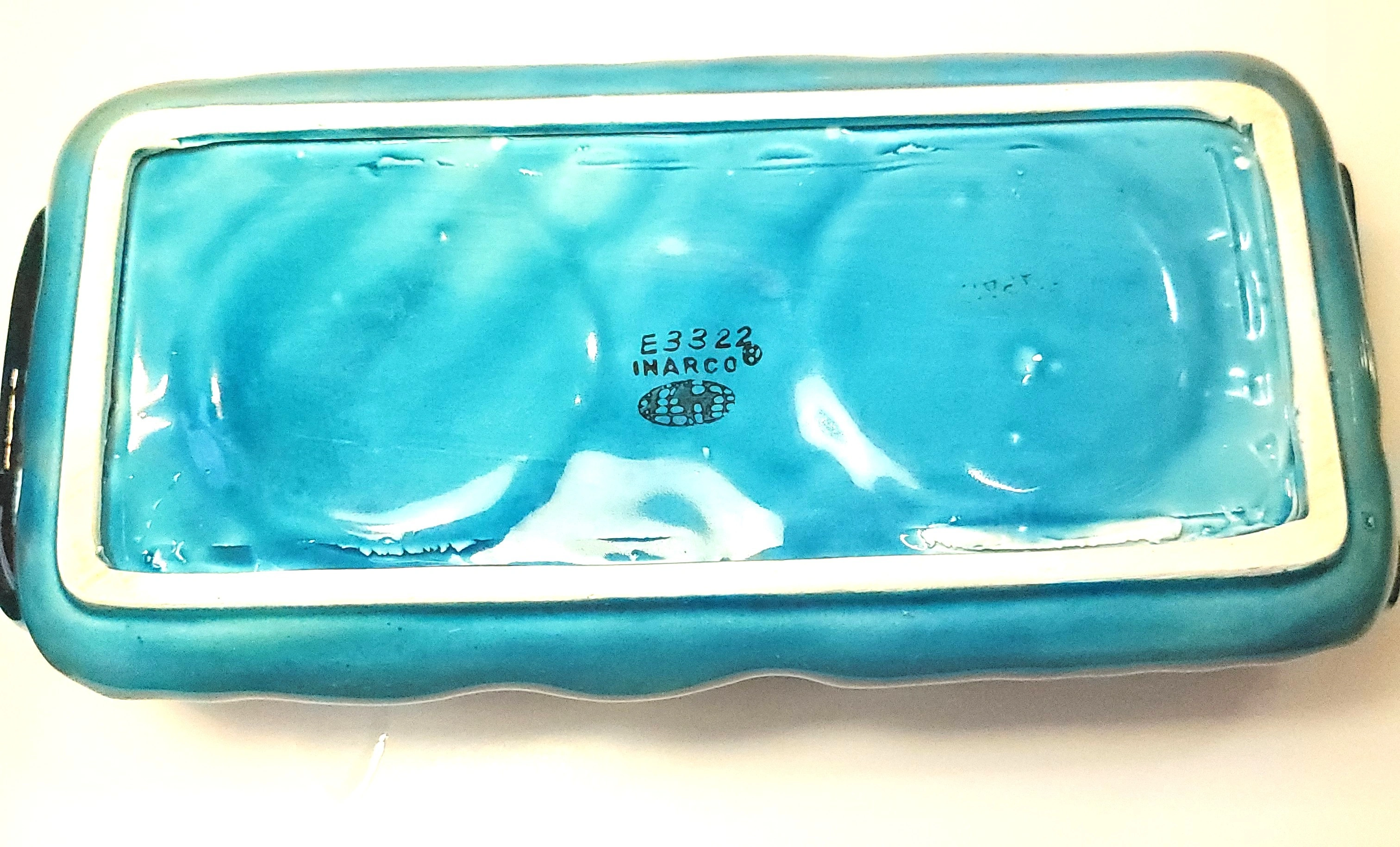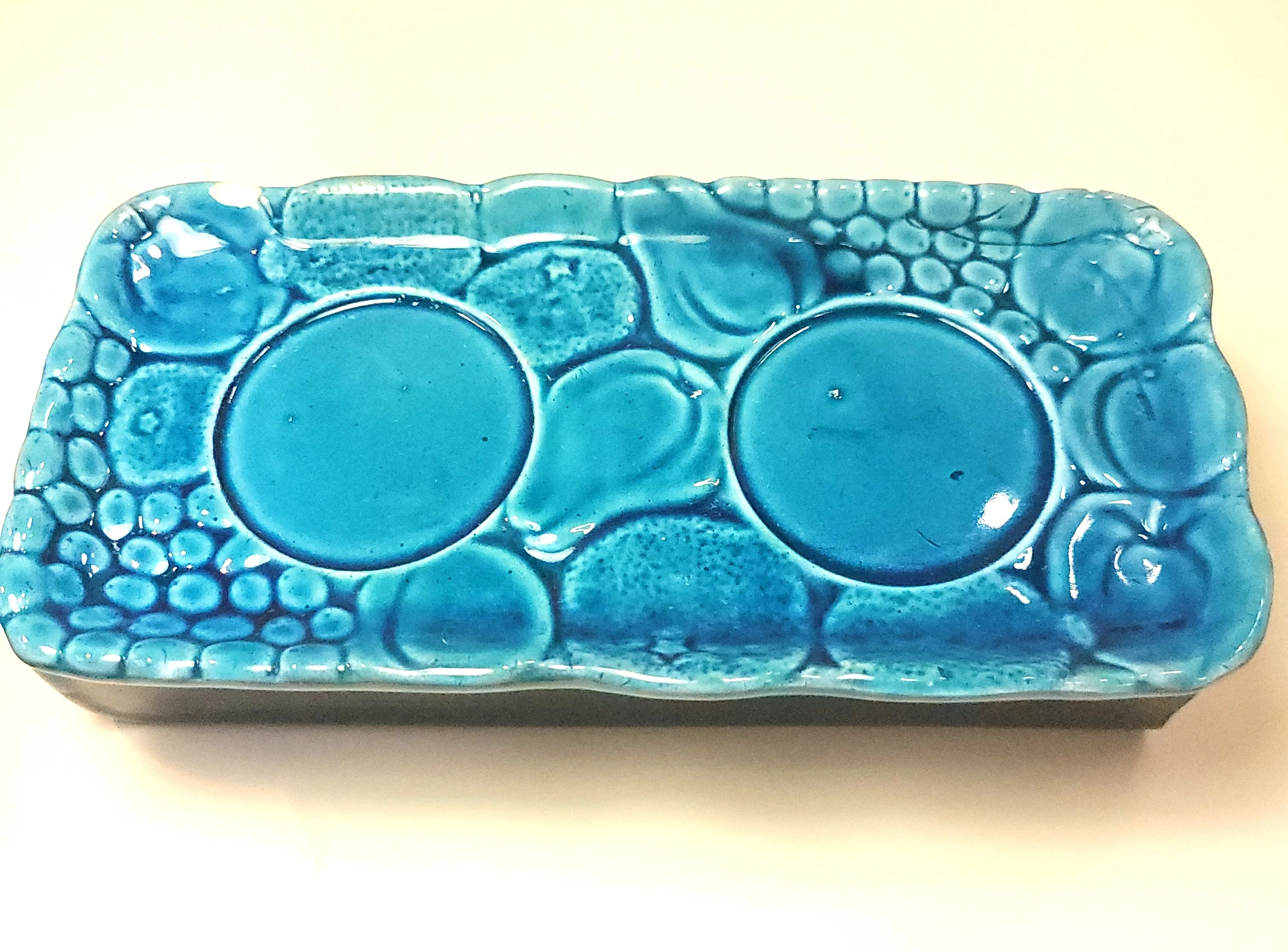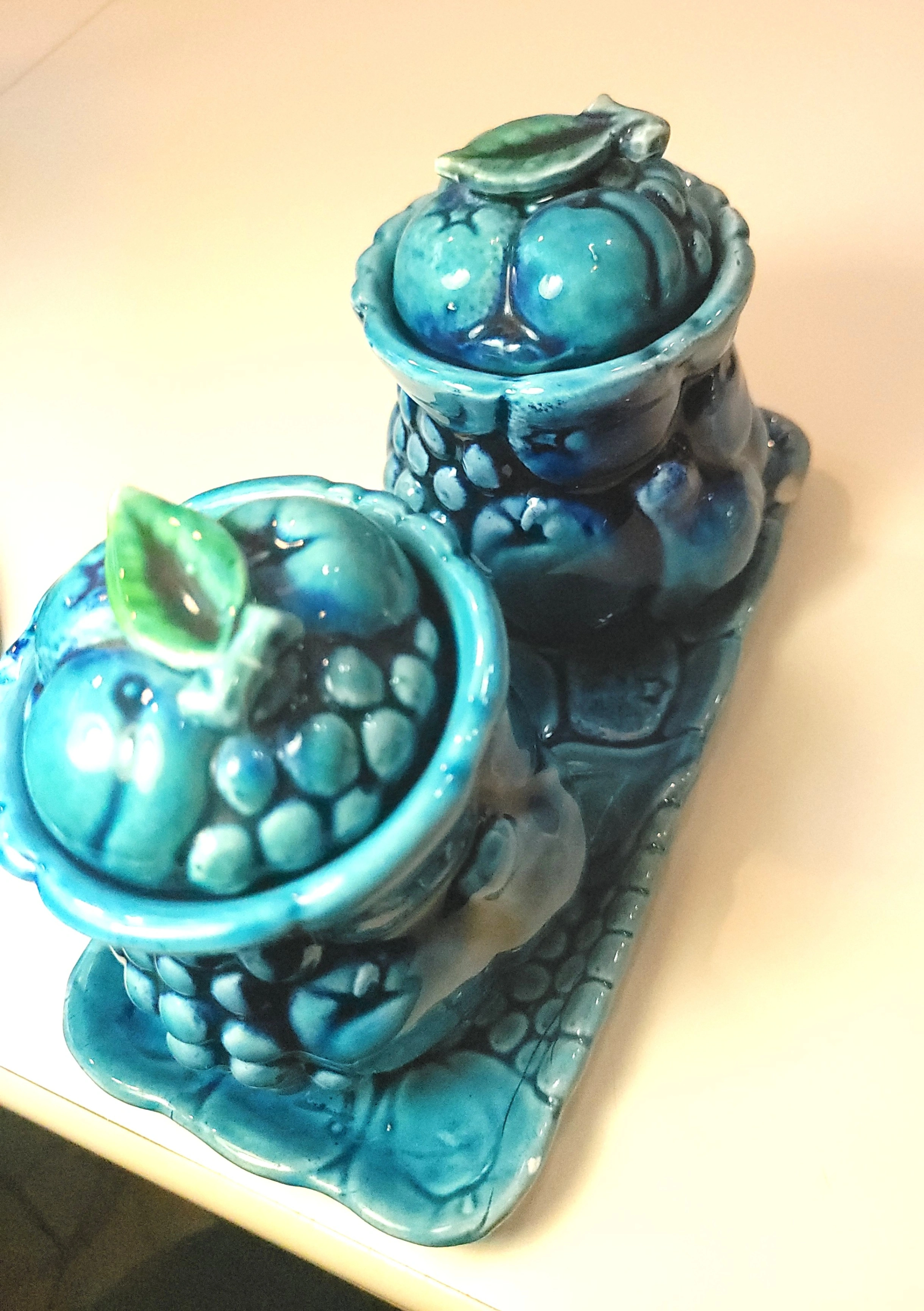 A classic piece of Mid-Century kitchenware, this Inarco "Mood Indigo" set (Design #E3322) features a high-gloss indigo blue glaze with embossed fruit motifs. This set is complete with both lidded jars and the original matching rectangular tray.