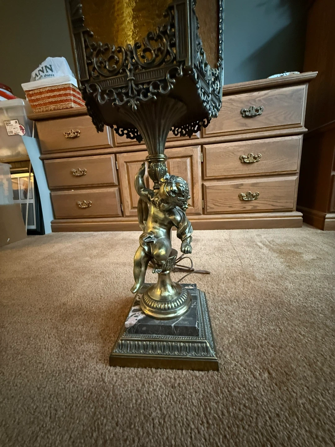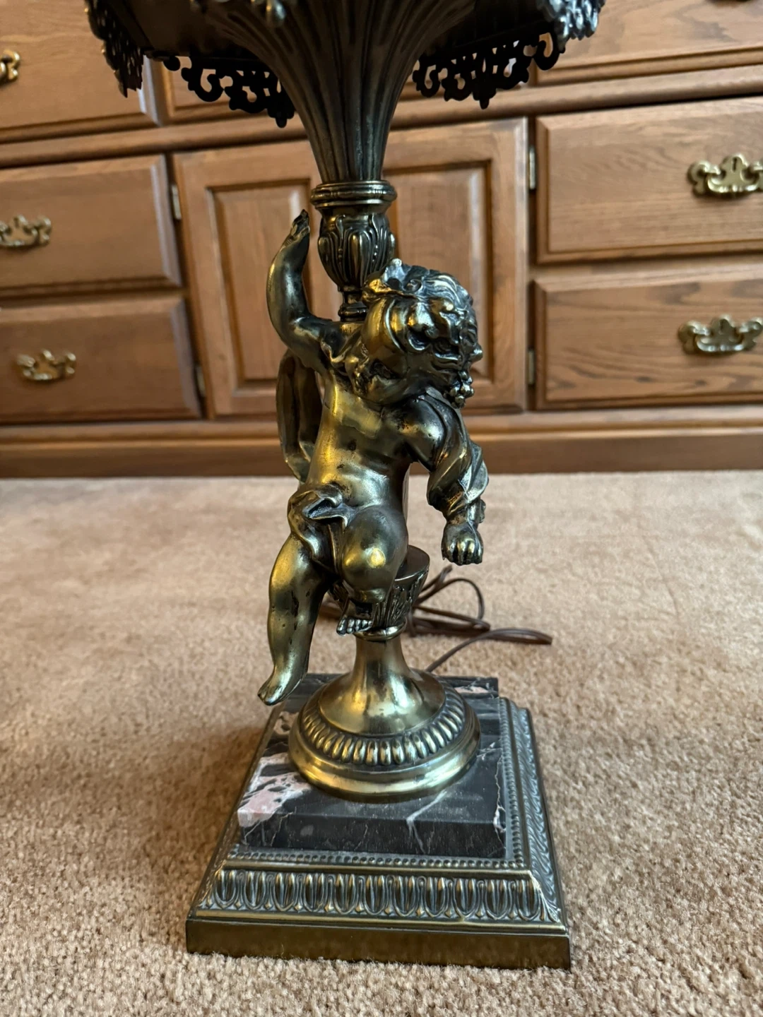 Ornate vintage accent lamp featuring a cherub base and an amber glass shade with decorative metalwork. It's a unique piece for adding a touch of vintage charm to any room. The lamp's design is intricate, with a substantial marble base. This lamp would be a conversation starter for a collector or someone who appreciates antique-style decor.