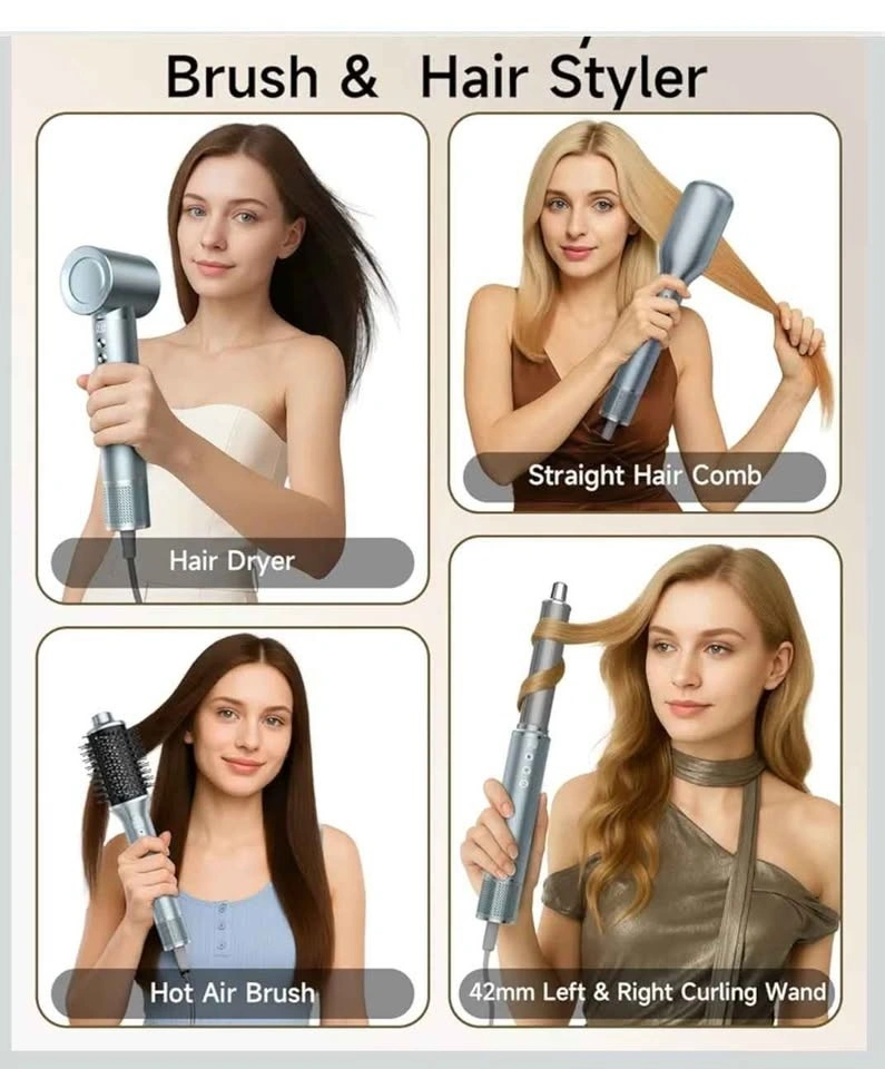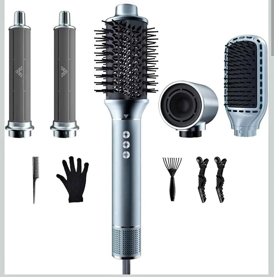 Brand new in box. All-in-1 hair styling tool with blow dry, curling, and brush attachments. Features 3 temperature settings and 3 speed settings. Includes left and right curling wands. An affordable Dyson dupe. 1100 watts. Great for a Christmas present.