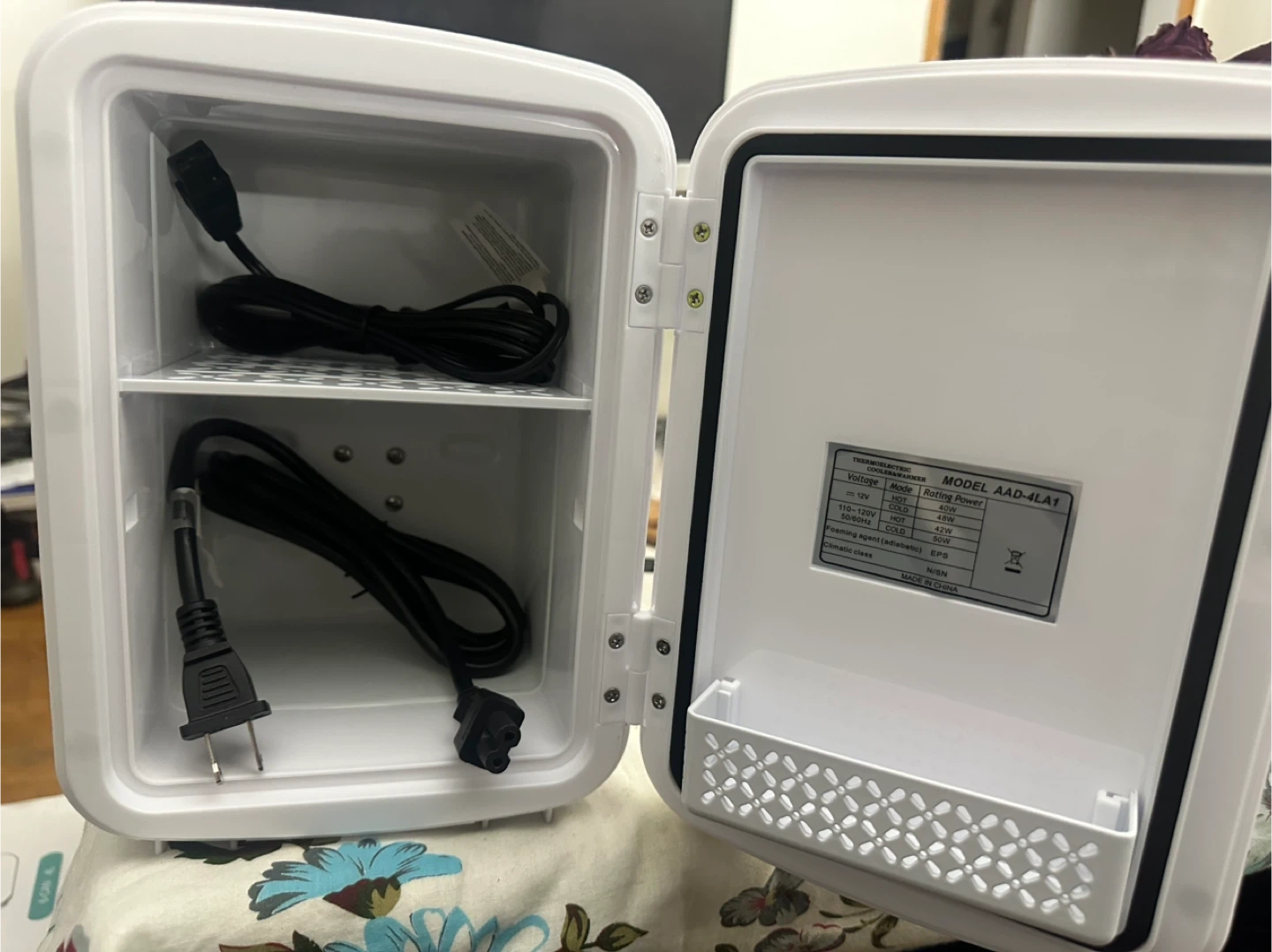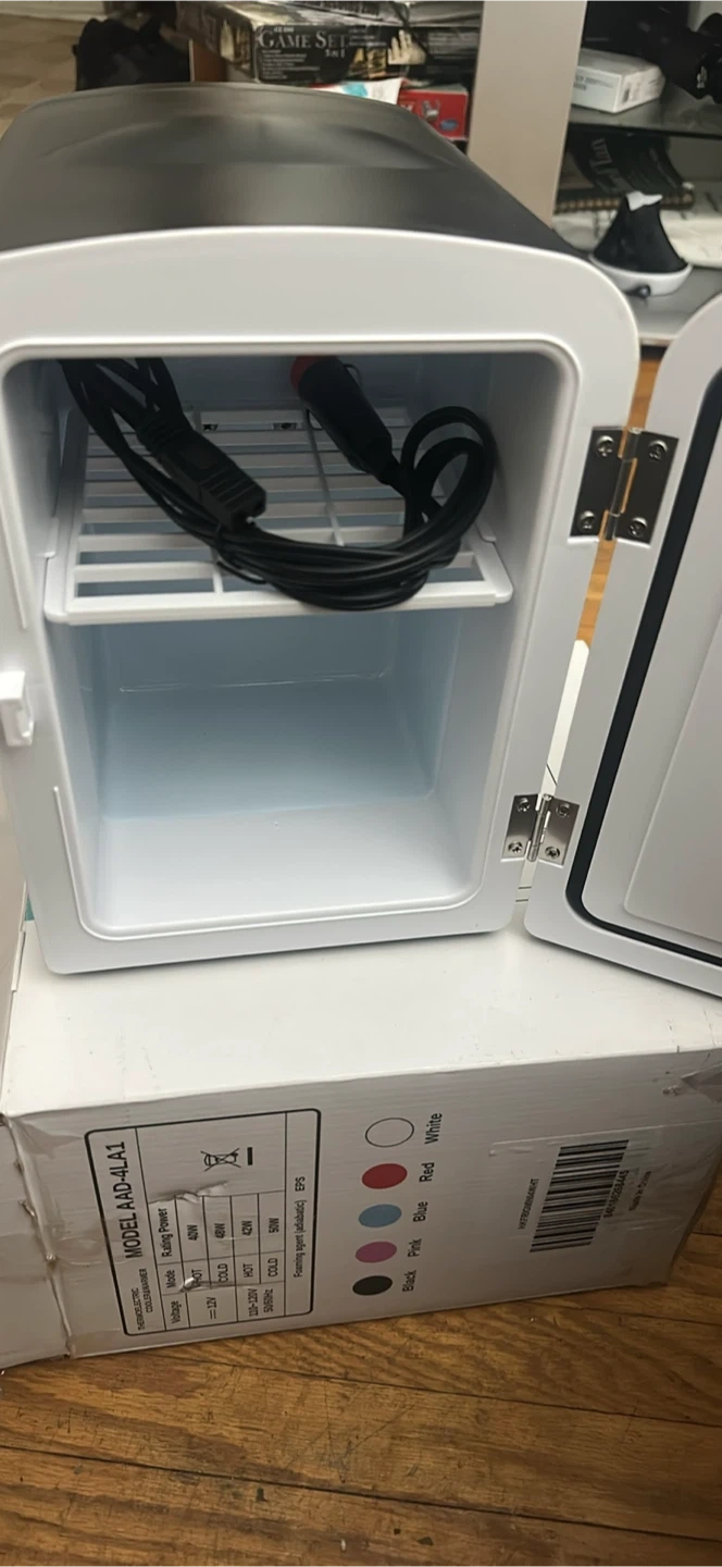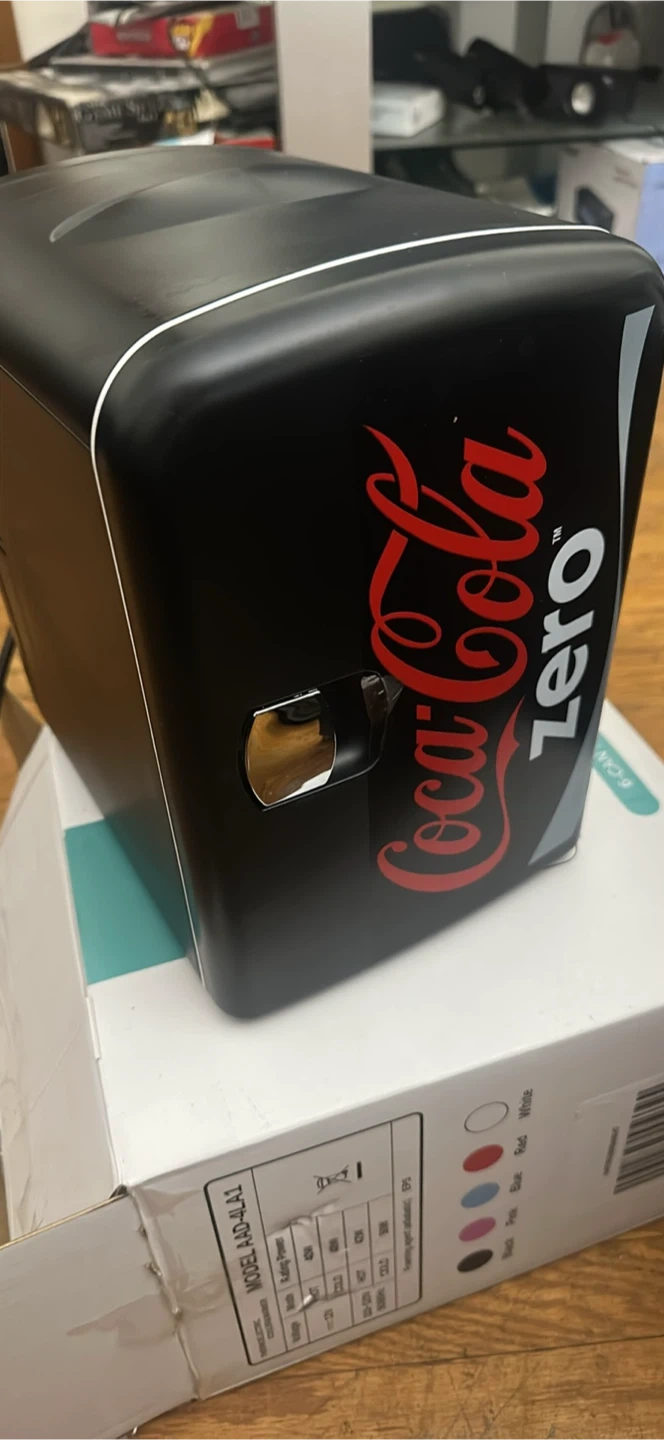 This is a Coca-Cola Zero branded mini fridge. It's black with the iconic Coke Zero logo. It comes with a power cord for your convenience. It's great for keeping drinks cool in a bedroom or office!