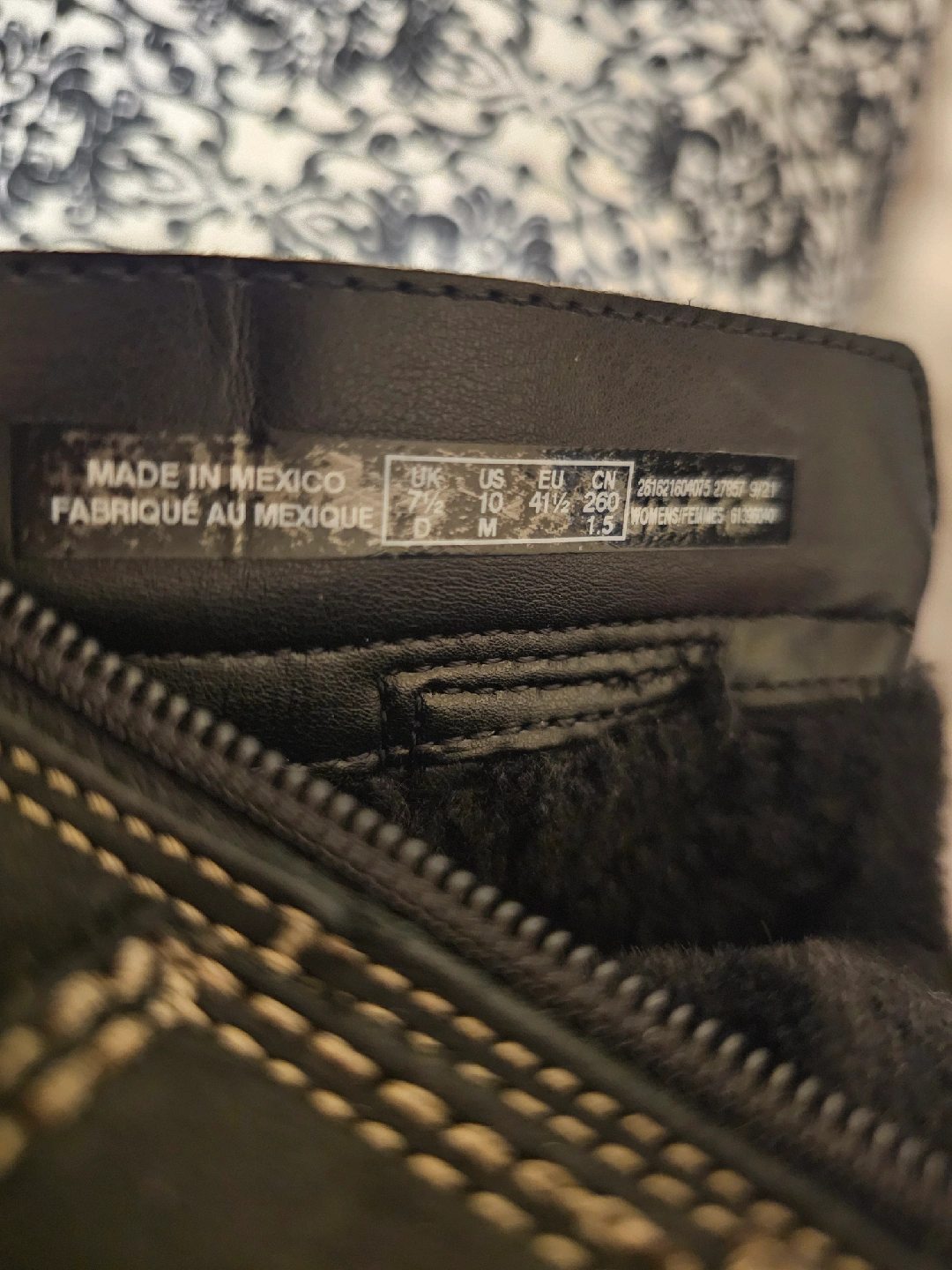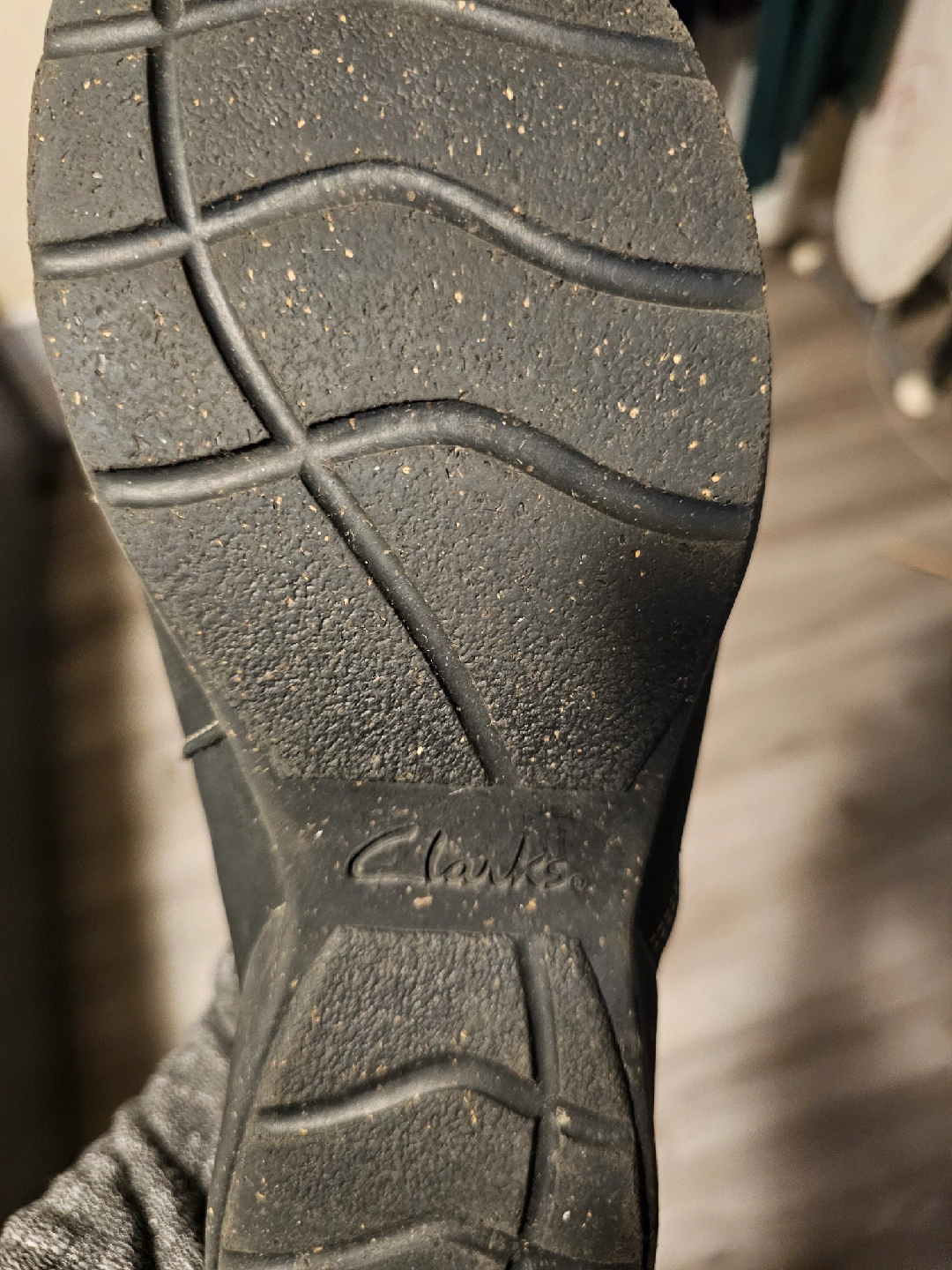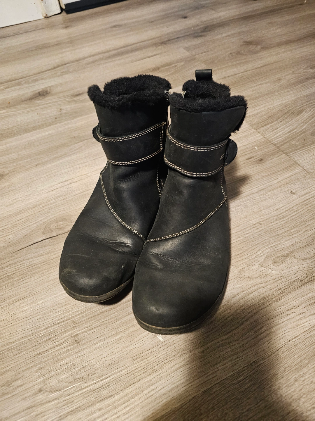 Selling a pair of Clarks black leather ankle boots in size 10. They're in good condition and have a stylish design with buckle detailing. Perfect for everyday wear!