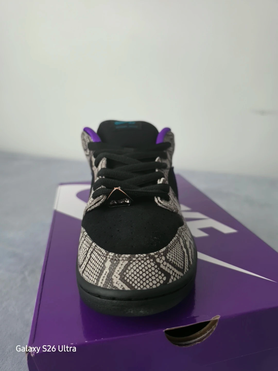 Exotic snakeskin overlays with purple and spruce accents.