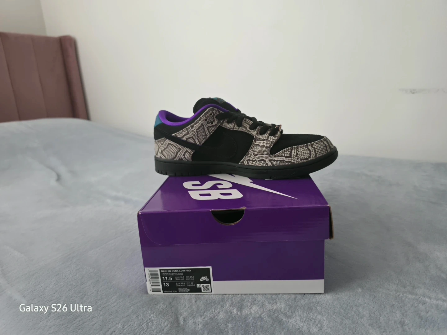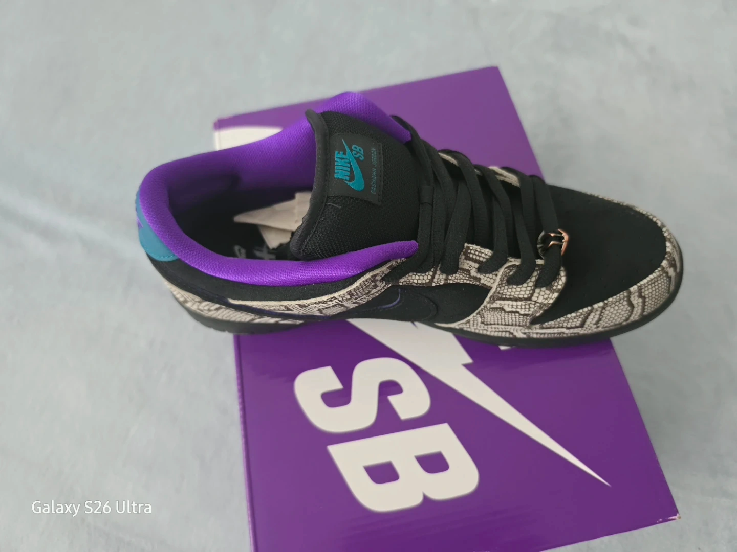 Exotic snakeskin overlays with purple and spruce accents.