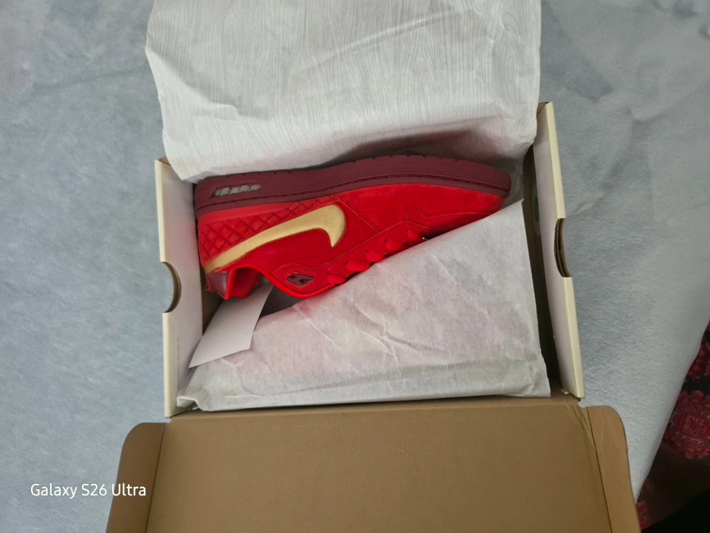 Classic red suede with metallic gold details and quilted heel.