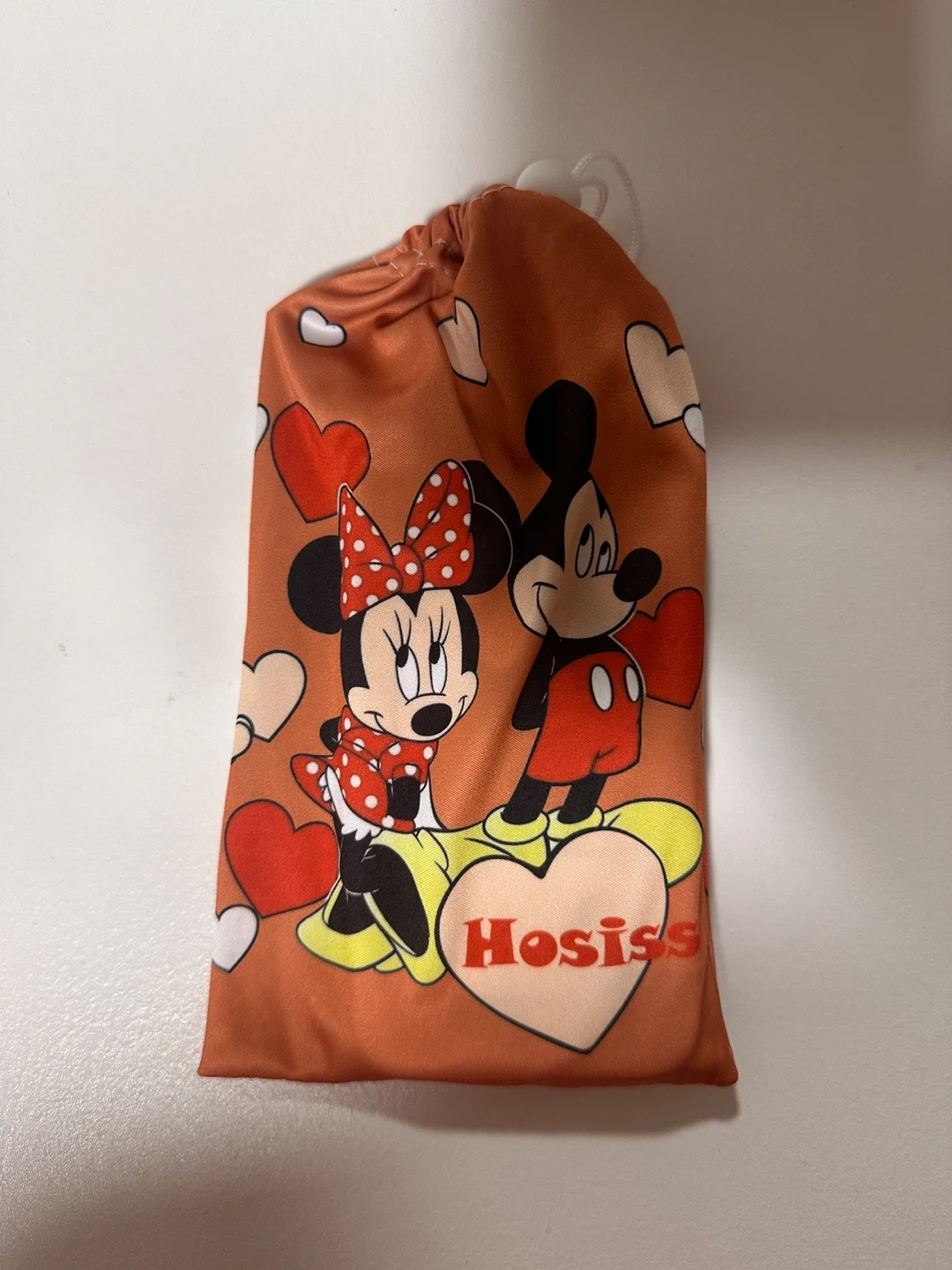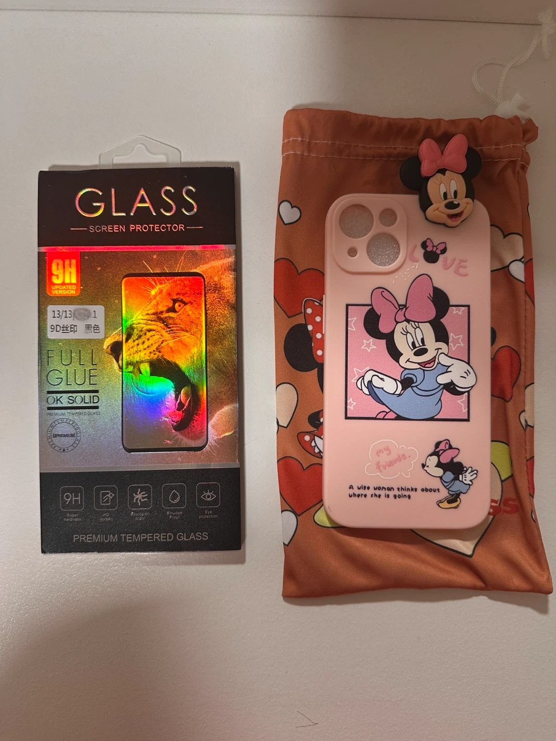 This is a pink Minnie Mouse themed phone case with a cute 3D embellishment. It comes with a premium tempered glass screen protector. Includes a drawstring storage bag with Mickey and Minnie graphics.