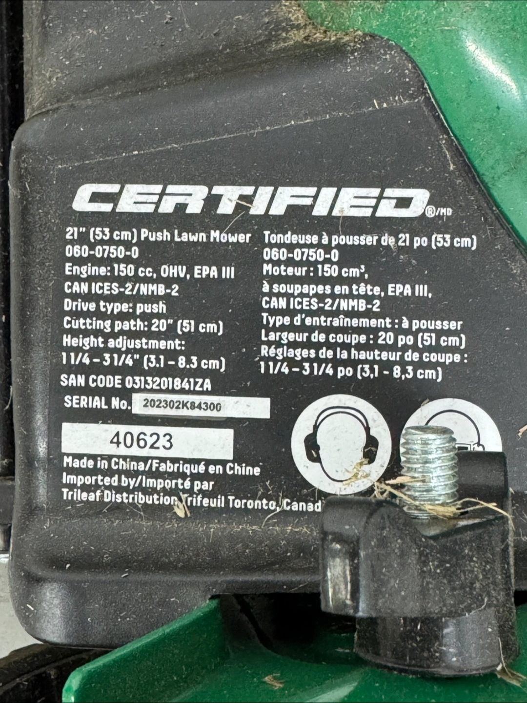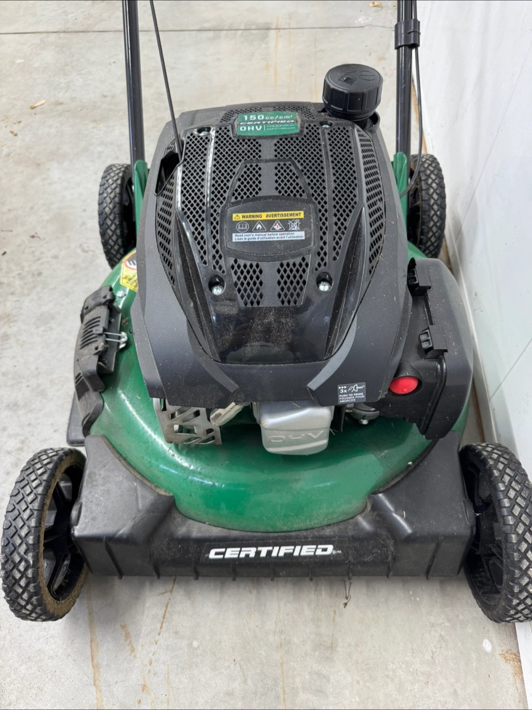Green lawn mower. Features four wheels and a black handle. Offers engine details with 150 cc/cm3. You can easily keep your lawn looking pristine with this mower.