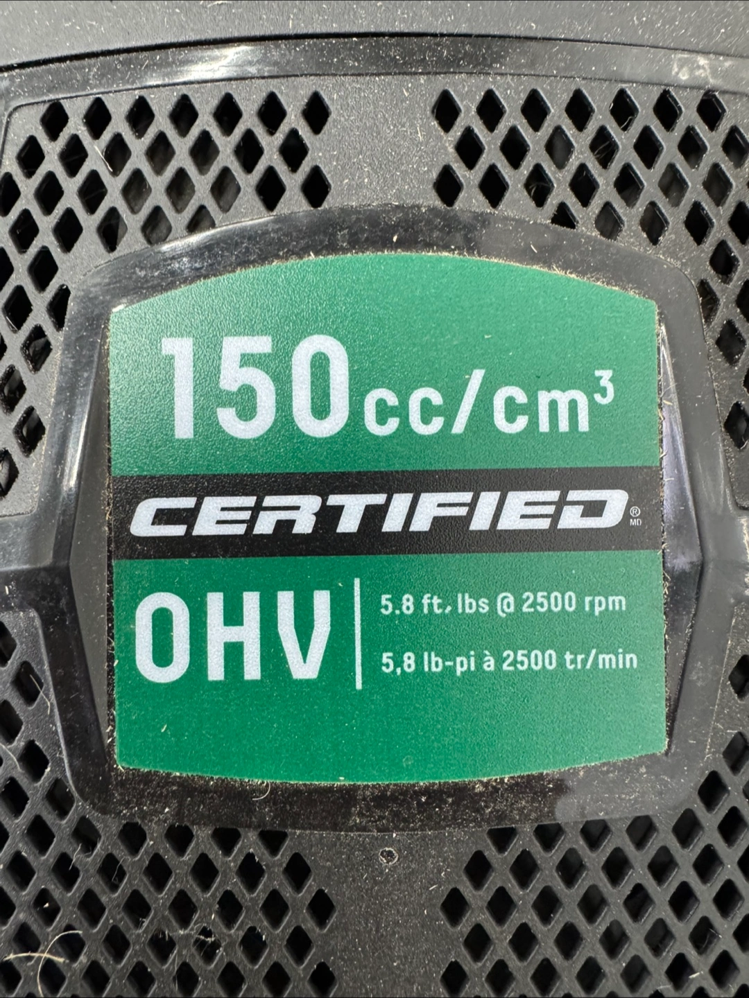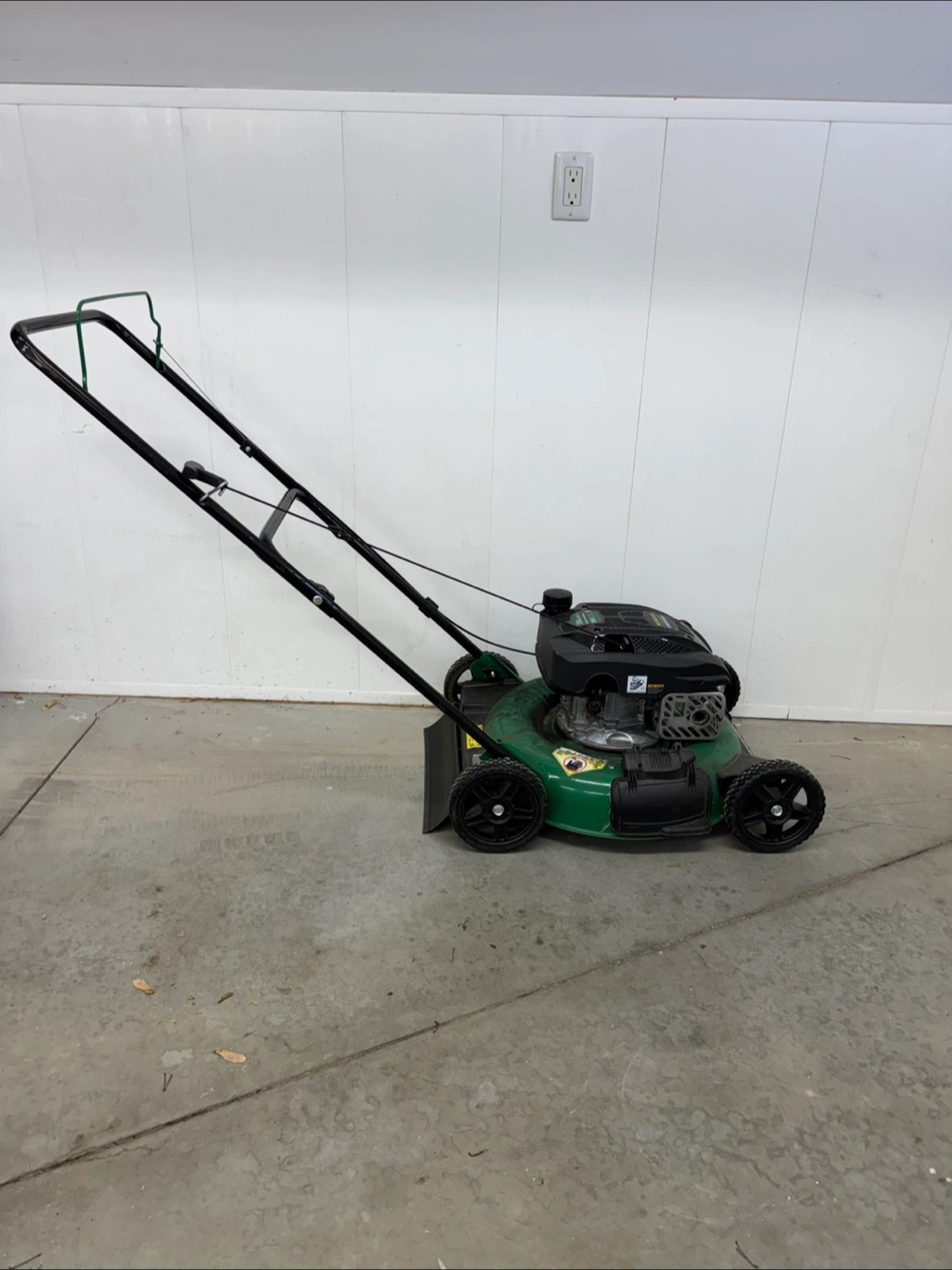Green lawn mower. Features four wheels and a black handle. Offers engine details with 150 cc/cm3. You can easily keep your lawn looking pristine with this mower.