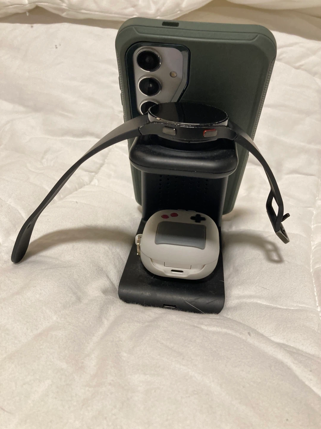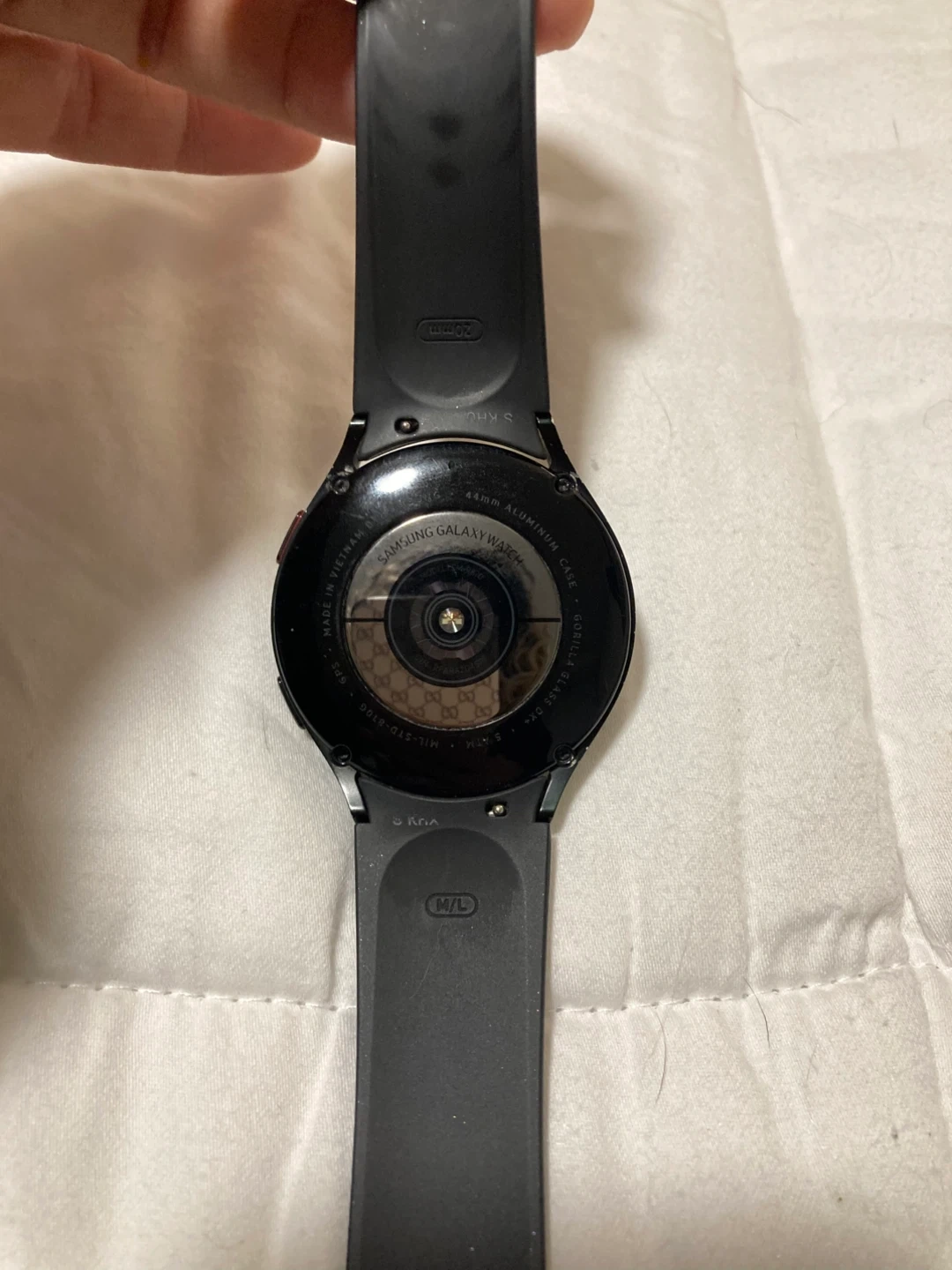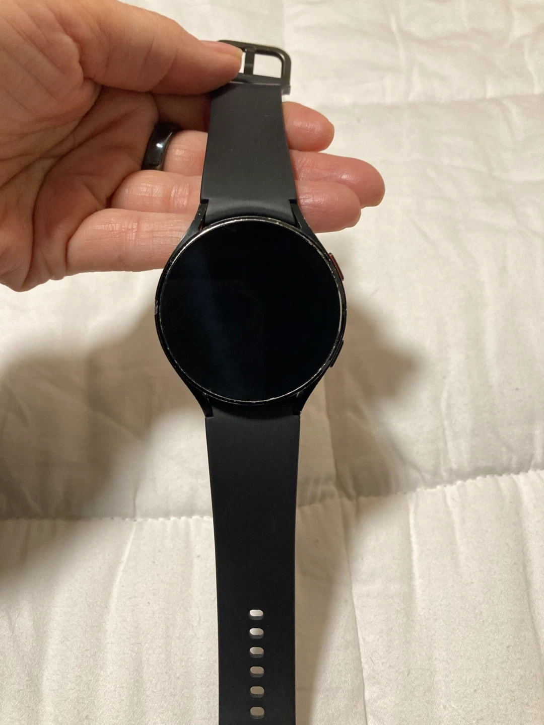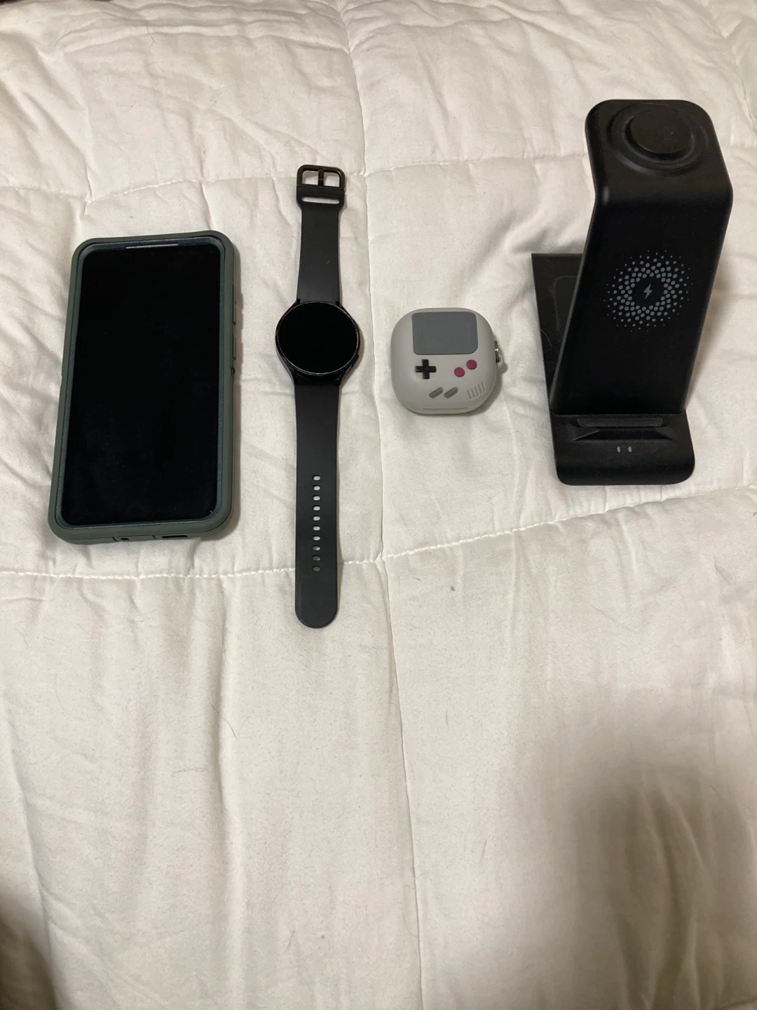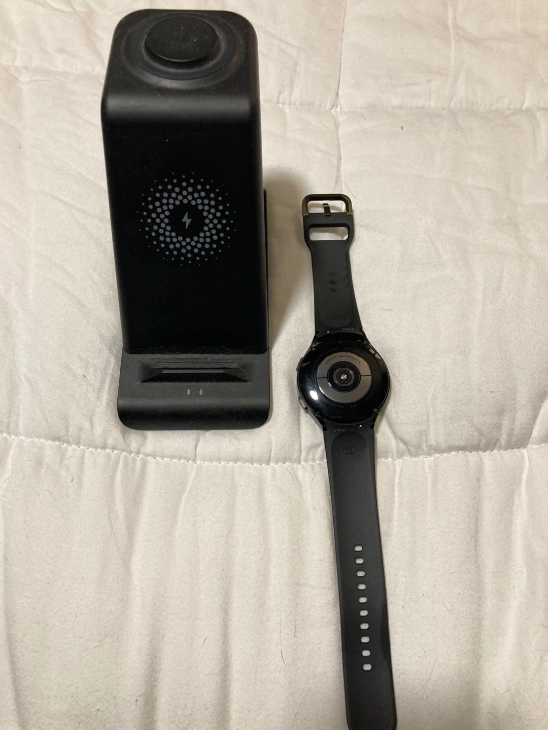Selling a Samsung Galaxy Watch 4 in black, 44mm size. It comes with a charger stand that works for watch, phone and earbuds.