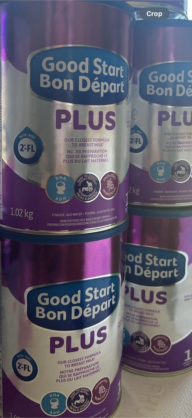 Three cans of Good Start Bon Départ Plus infant formula. Each can is 1.02 kg. Closest formula to breast milk. Contains DHA, ADH, probiotics, and easy-to-digest proteins.