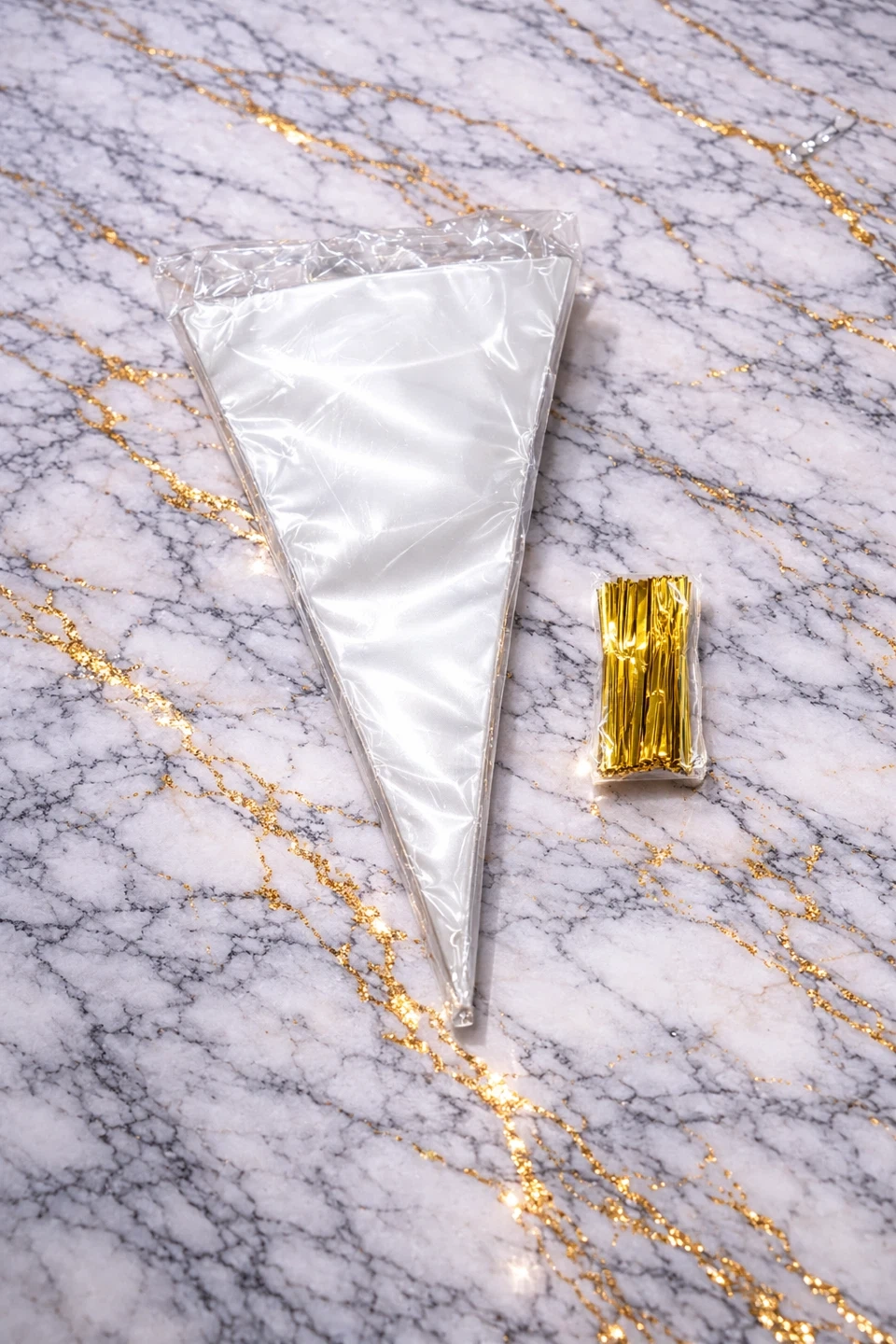 Disposable pastry piping bags for decorating cakes and cookies. Includes a pack of gold ties for securing the bags. Easy to use for home baking projects!