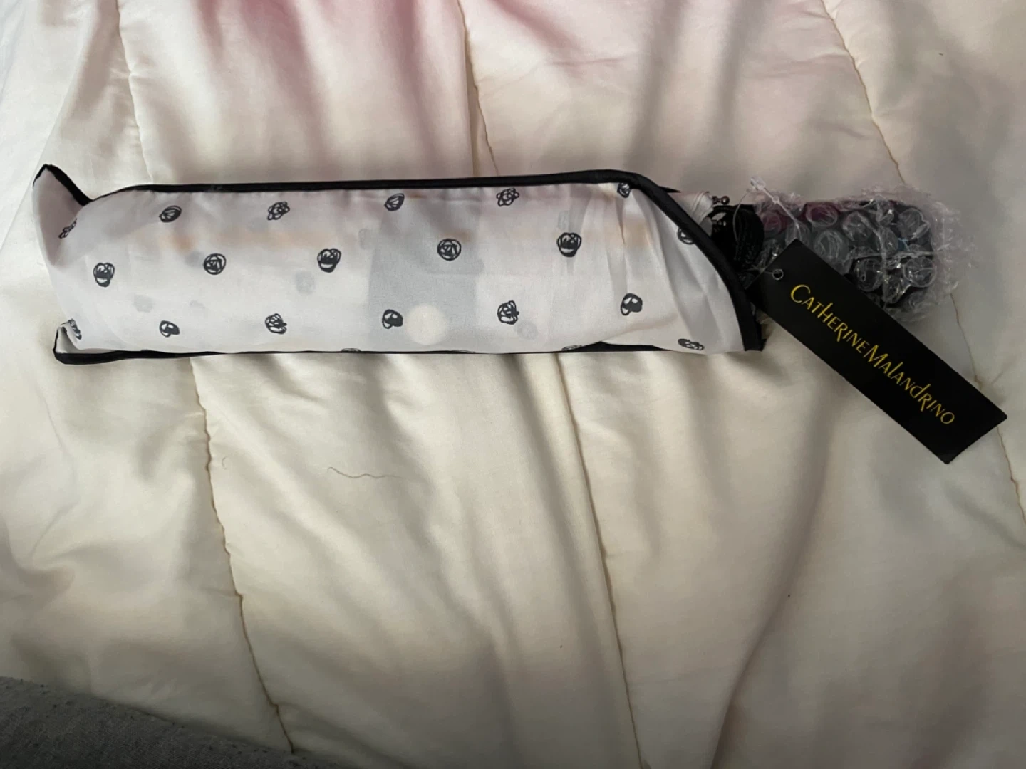 This is a Catherine Malandrino umbrella. It features a white fabric with a black skull pattern. It's in its original packaging.