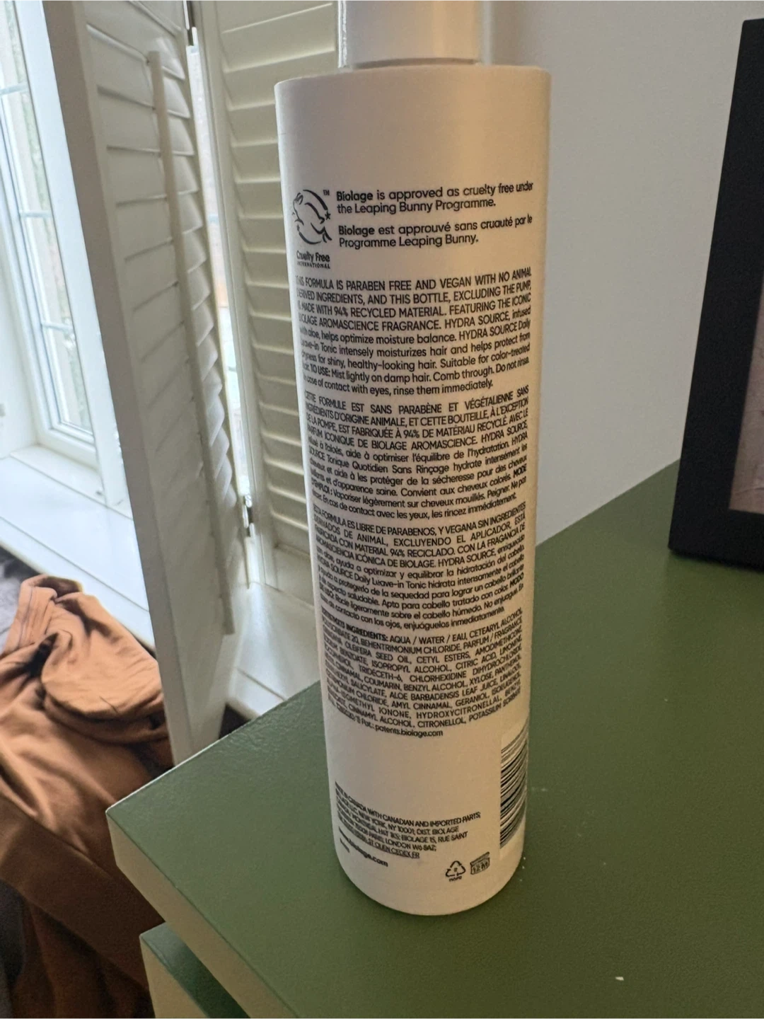 Selling a Biolage Hydra Source daily leave-in tonic for dry hair. It comes in a 13.5 fl oz / 400 ml bottle. Biolage is approved as cruelty free under the Leaping Bunny Programme