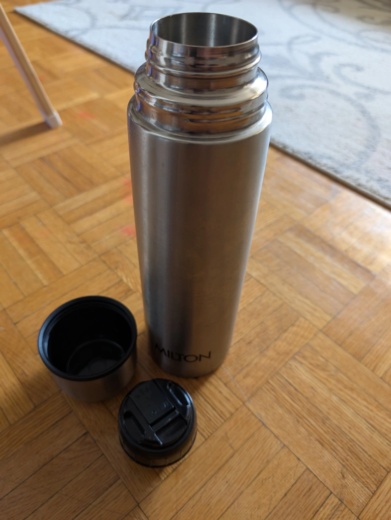A stainless steel thermos. A tall, cylindrical shape with a screw-on lid. This is an easy way to bring your tea or coffee on the go and have it stay warm for a while.
