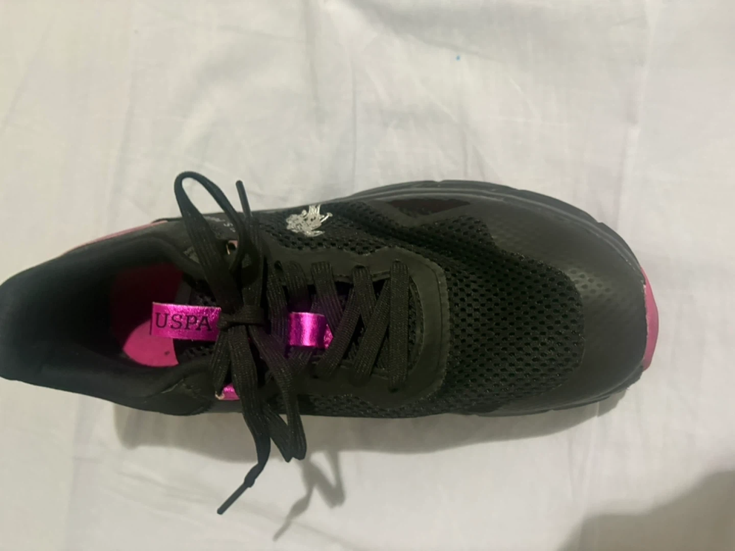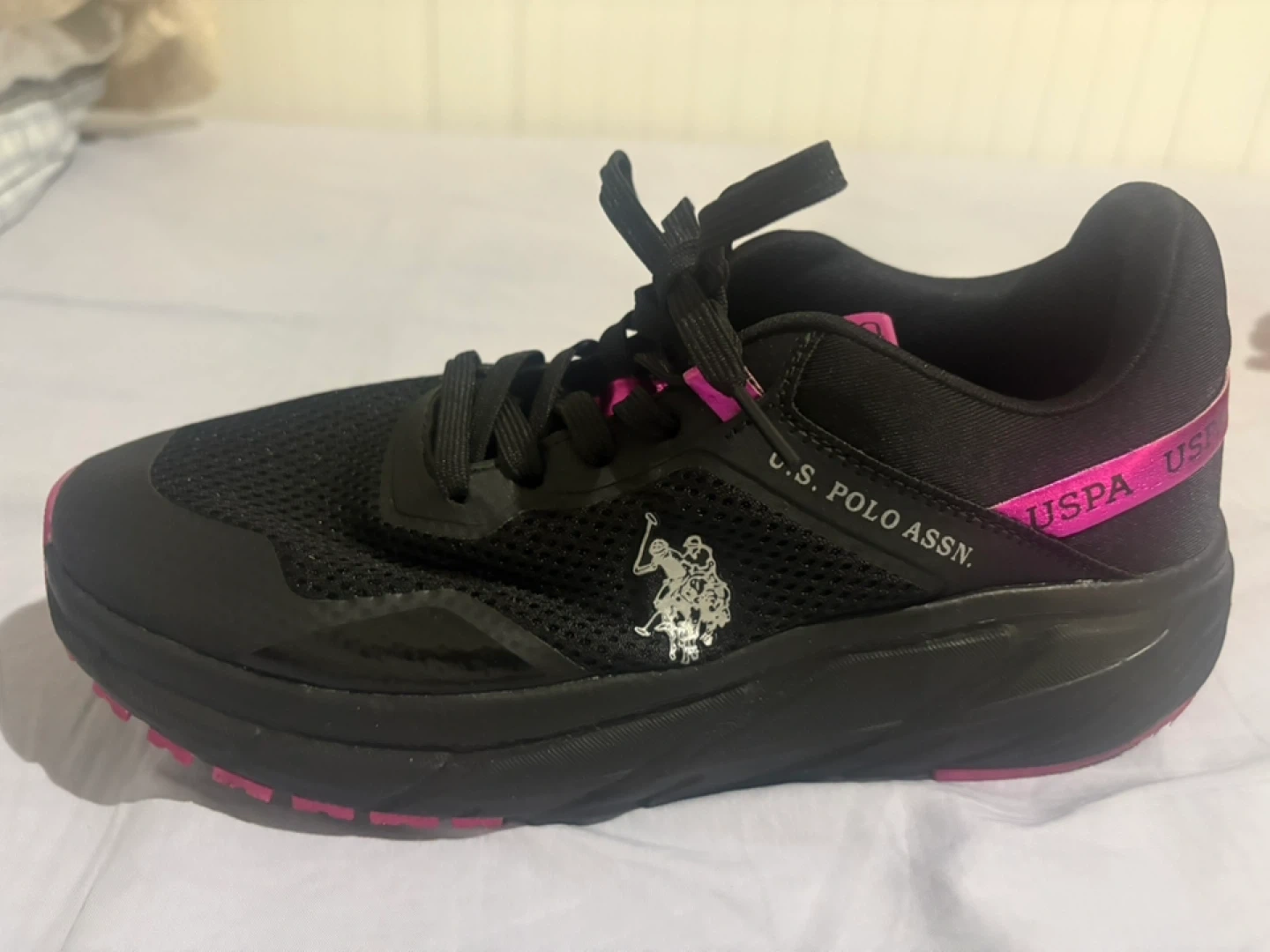 Selling a pair of U.S. Polo Assn. women's running shoes. They are black with pink accents. Great for everyday wear or hitting the pavement for a run!