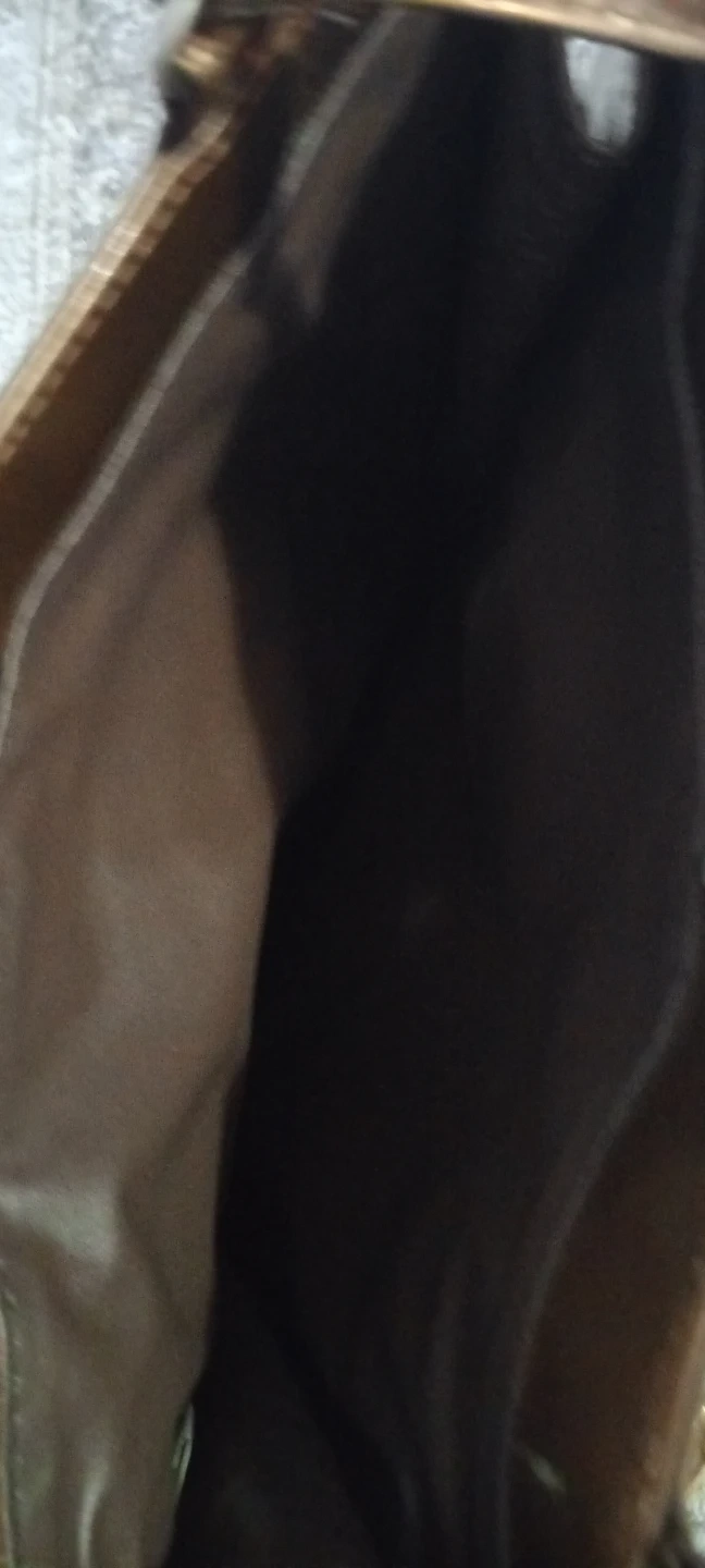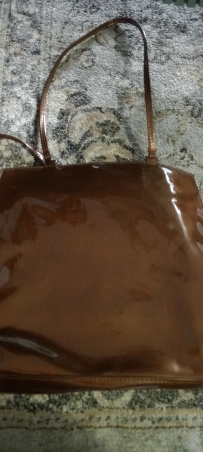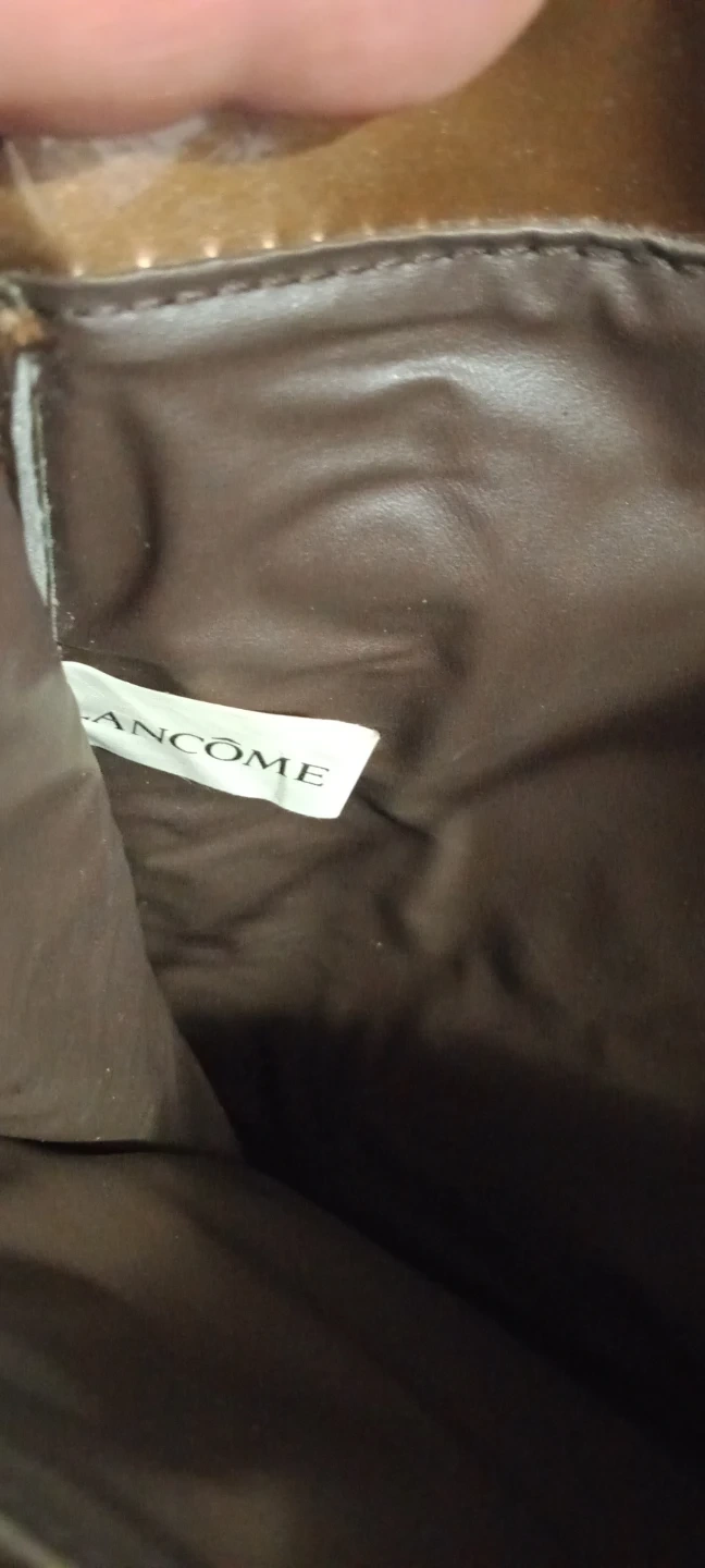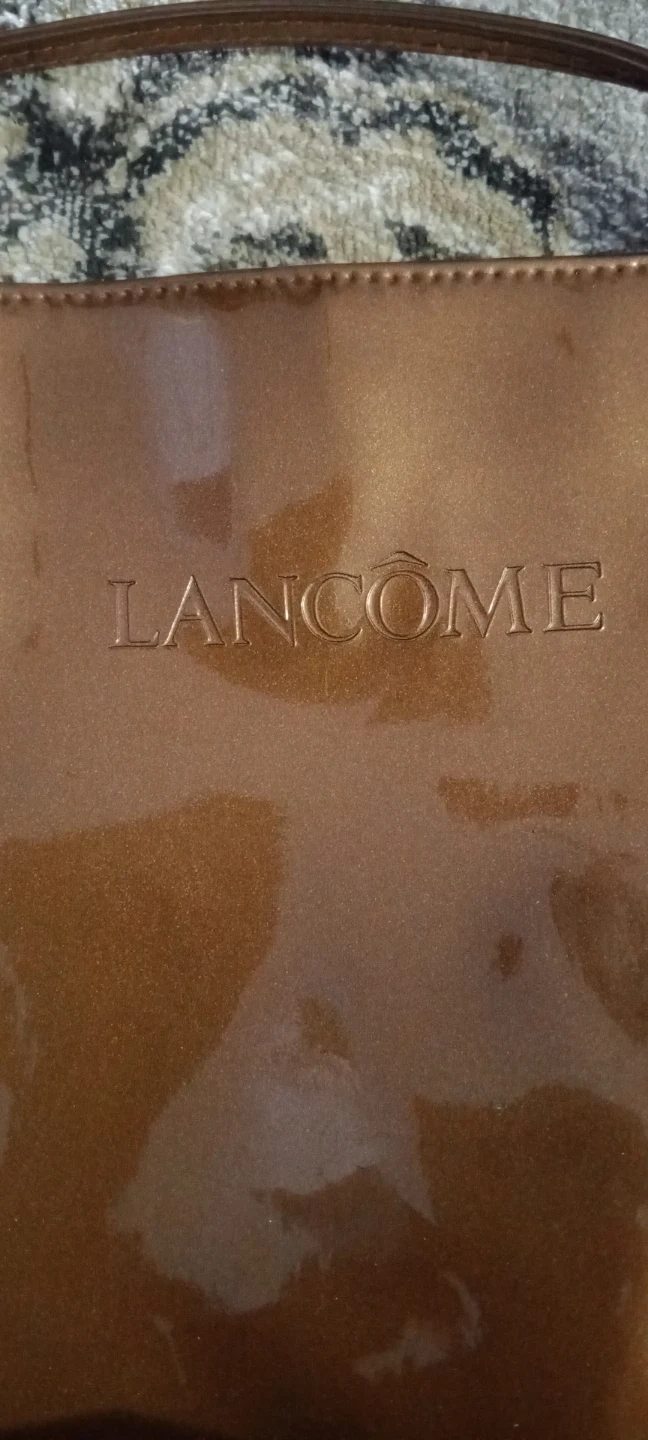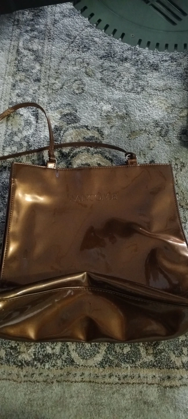 This is a shiny brown patent leather shoulder bag from Lancôme. It has a classic shape and a single strap. Interior lining is visible. Vintage 😉😍