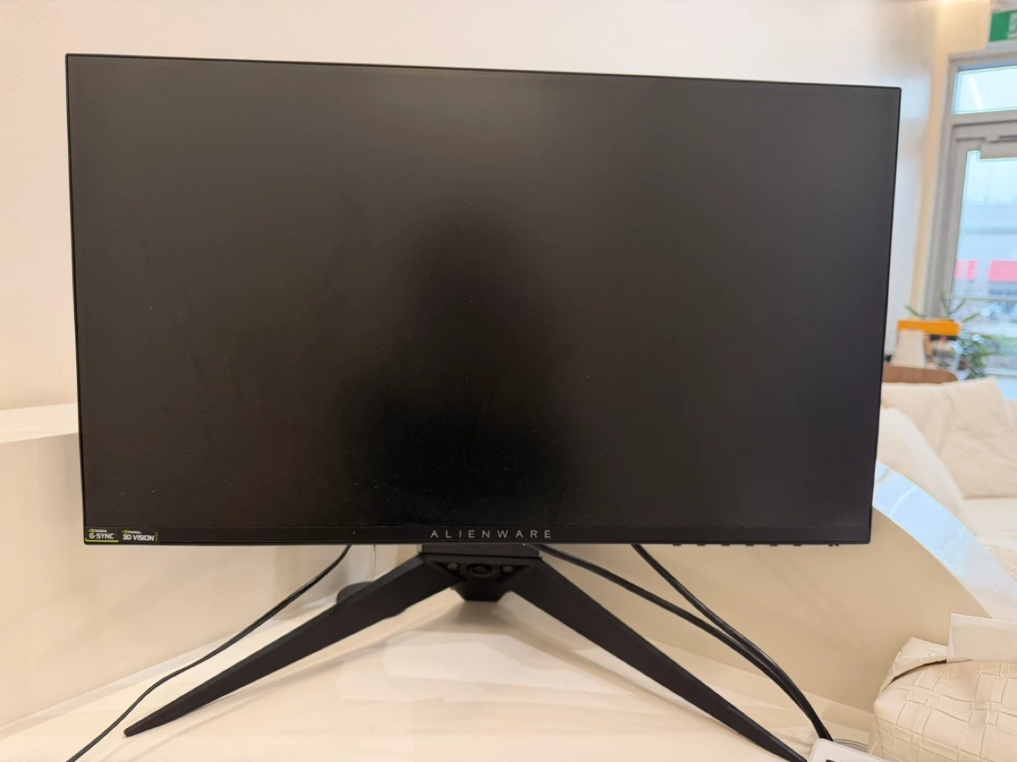This is an Alienware gaming monitor. It features a sleek black design and G-Sync/3D Vision support. It's built for an immersive gaming experience!
