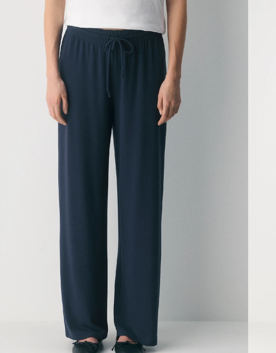 Navy blue lounge pants with a drawstring waist. These pants have a wide leg cut. They're made from a soft, flowy material perfect for relaxing.