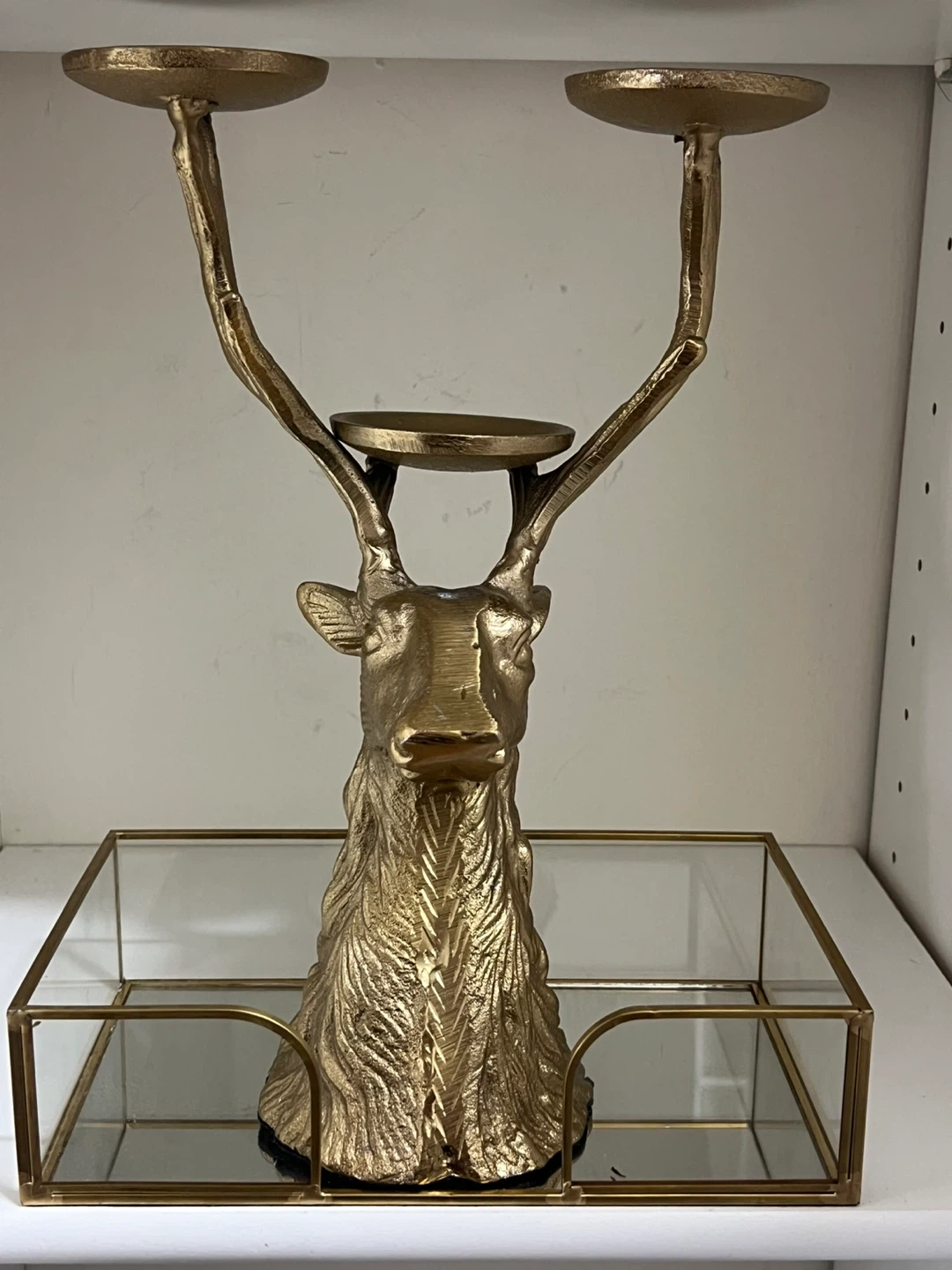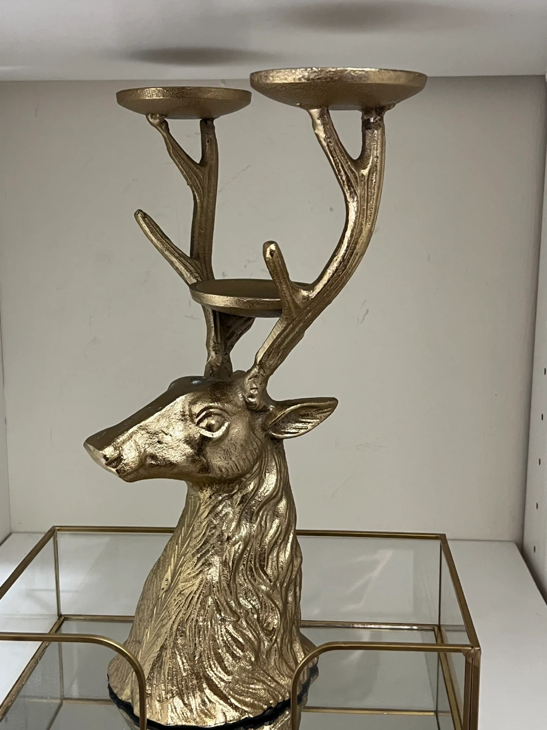 This decorative candlestick holder is designed in the shape of a gold deer head with antlers. It's made of metal and has a textured finish. It's perfect for holding two taper candles, adding a festive touch to your mantel or table.