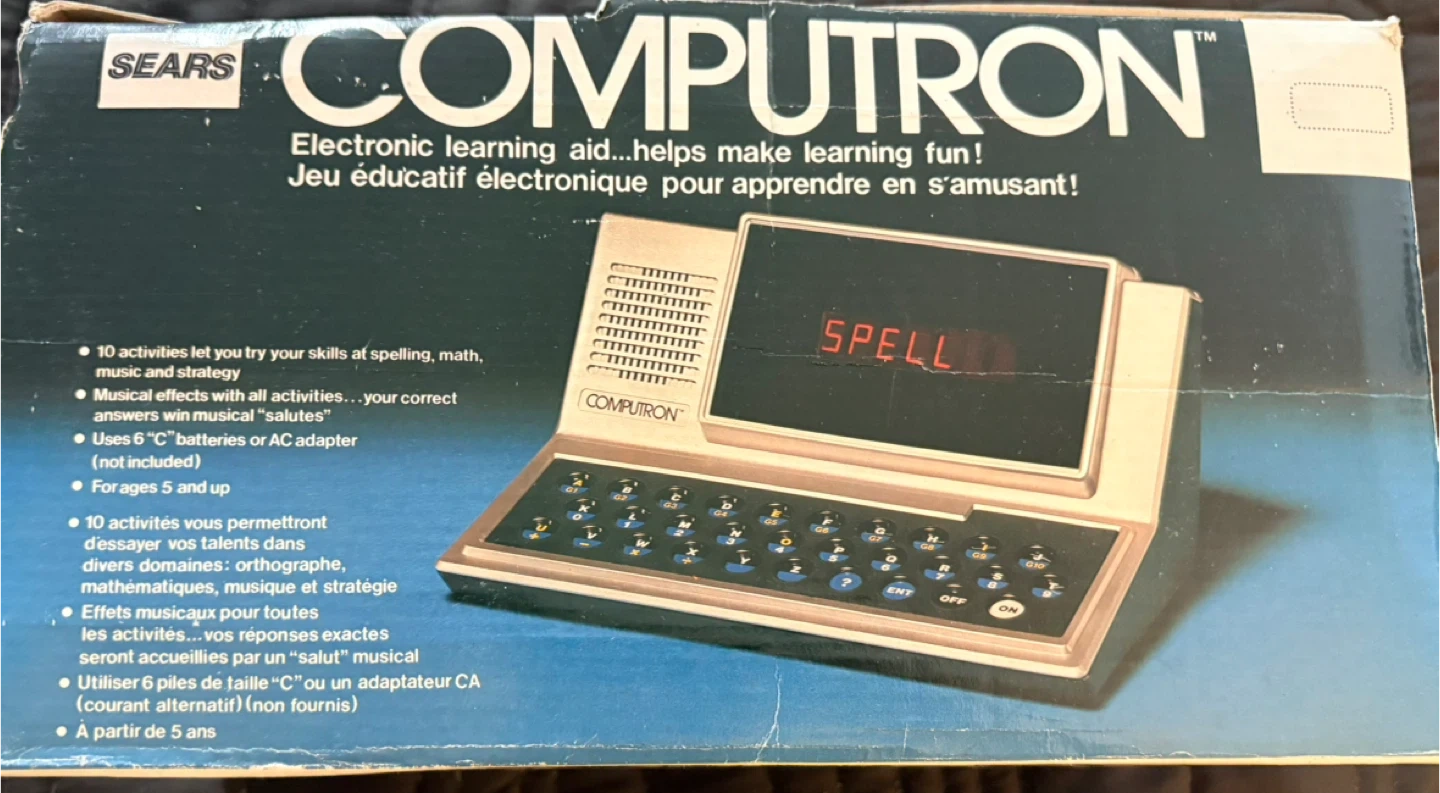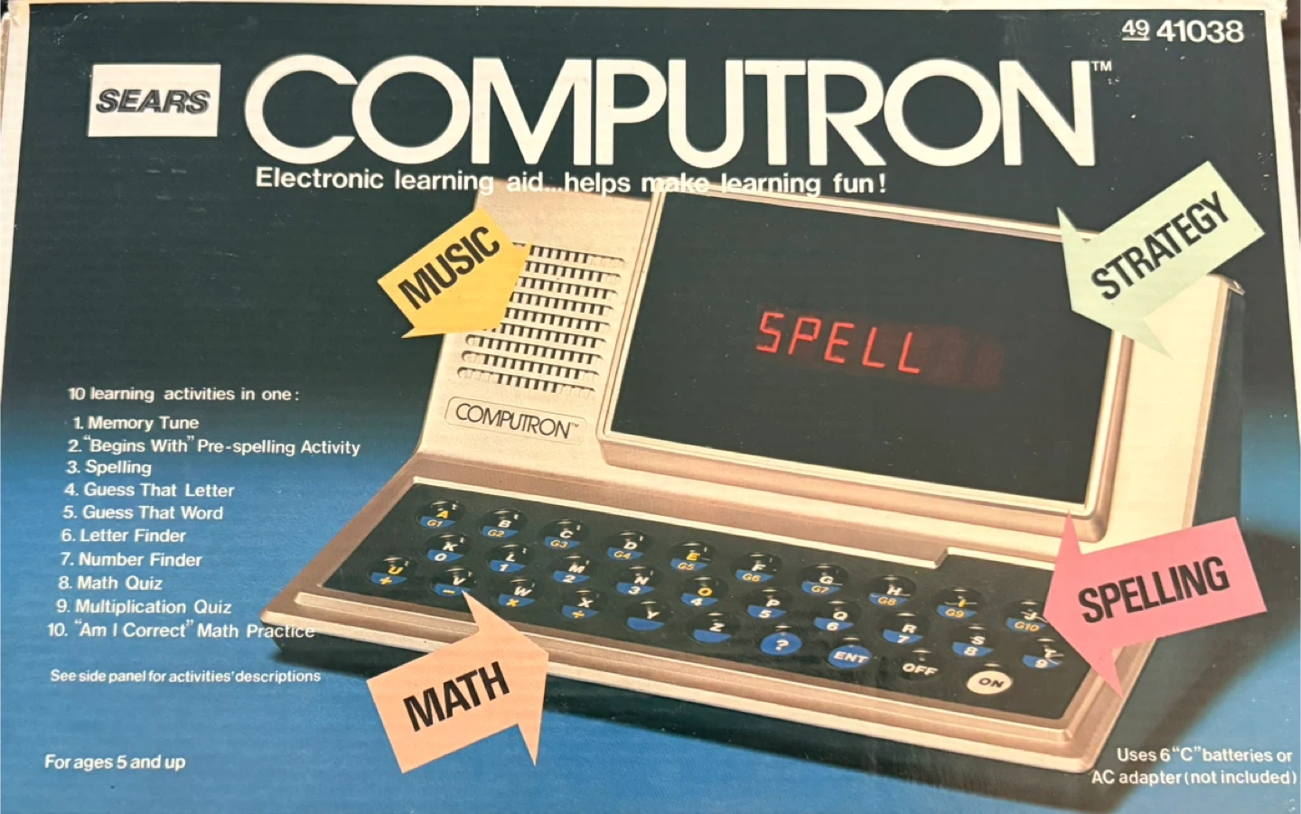 Selling a vintage Sears Computron electronic learning aid! It's an electronic learning aid to help make learning fun. It has 10 learning activities in one, including Memory Tune, Pre-spelling Activity, Spelling, Math Quiz, and more! It's for ages 5 and up. Uses 6 "C" batteries or AC adapter (not included).