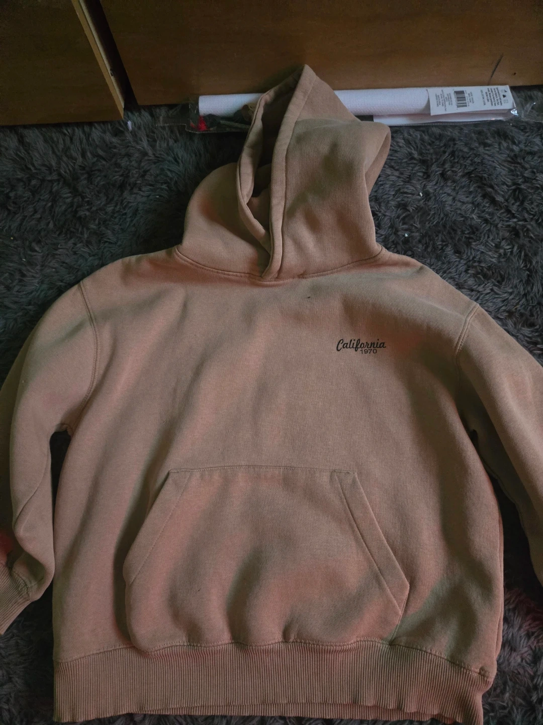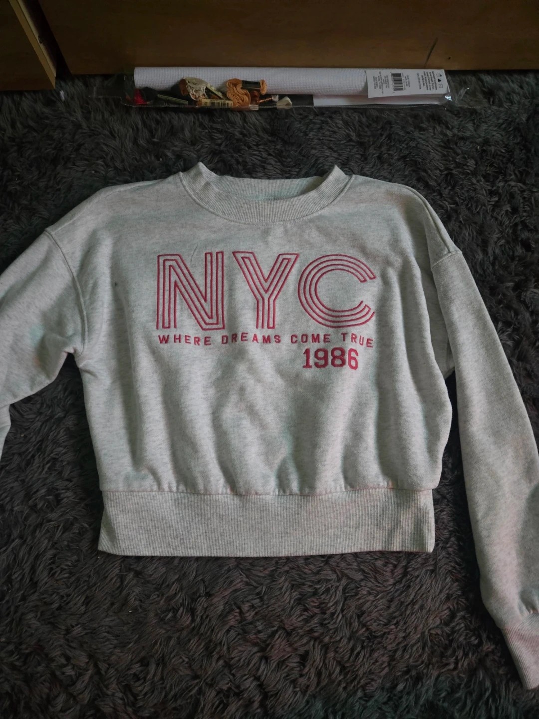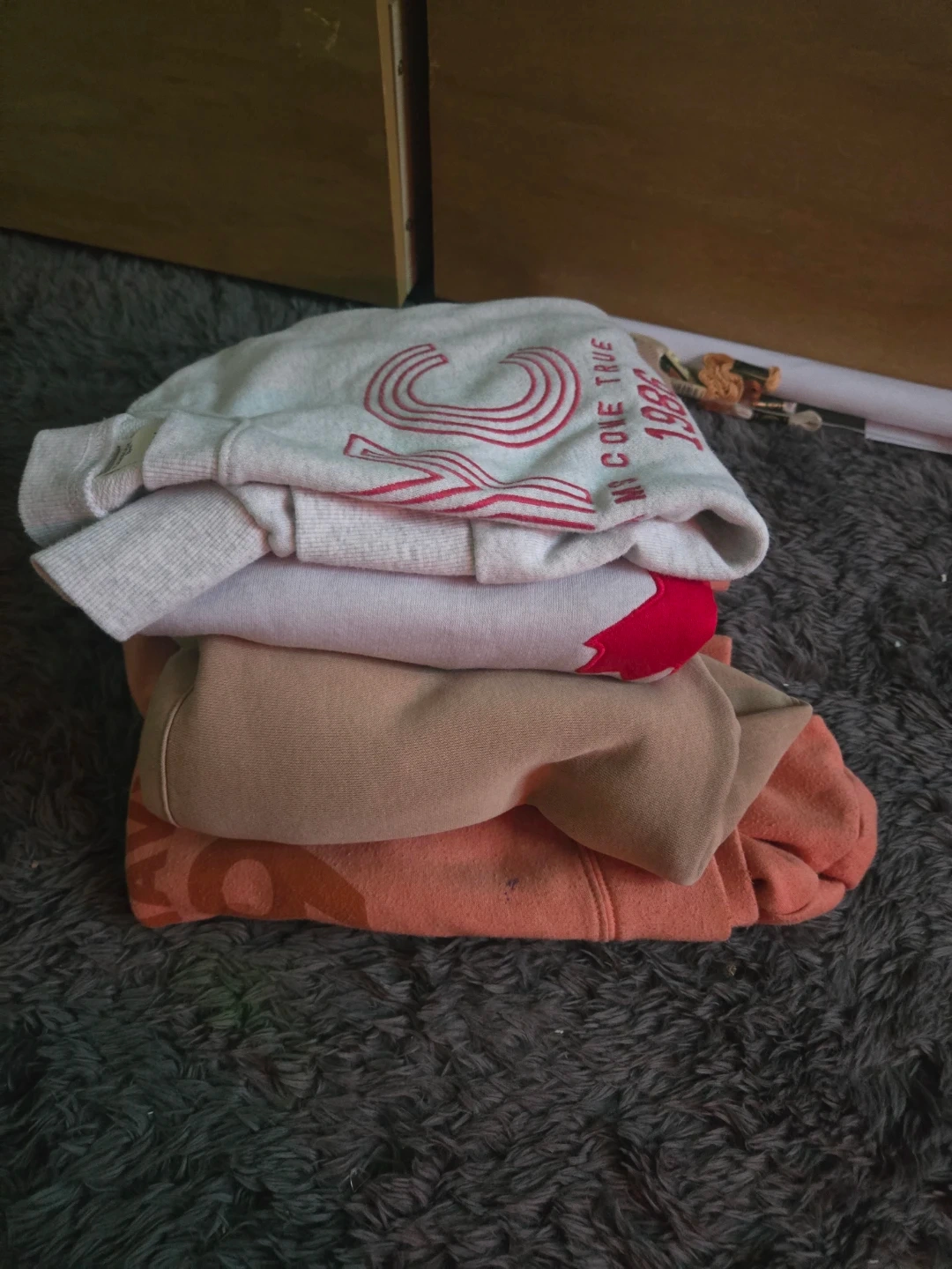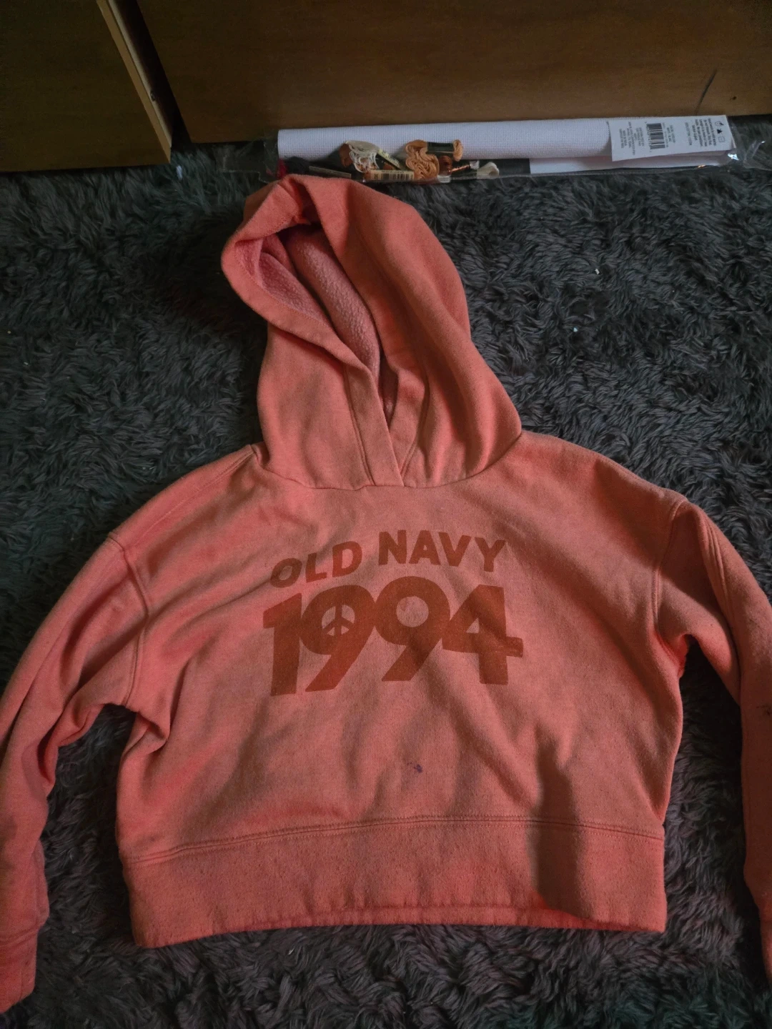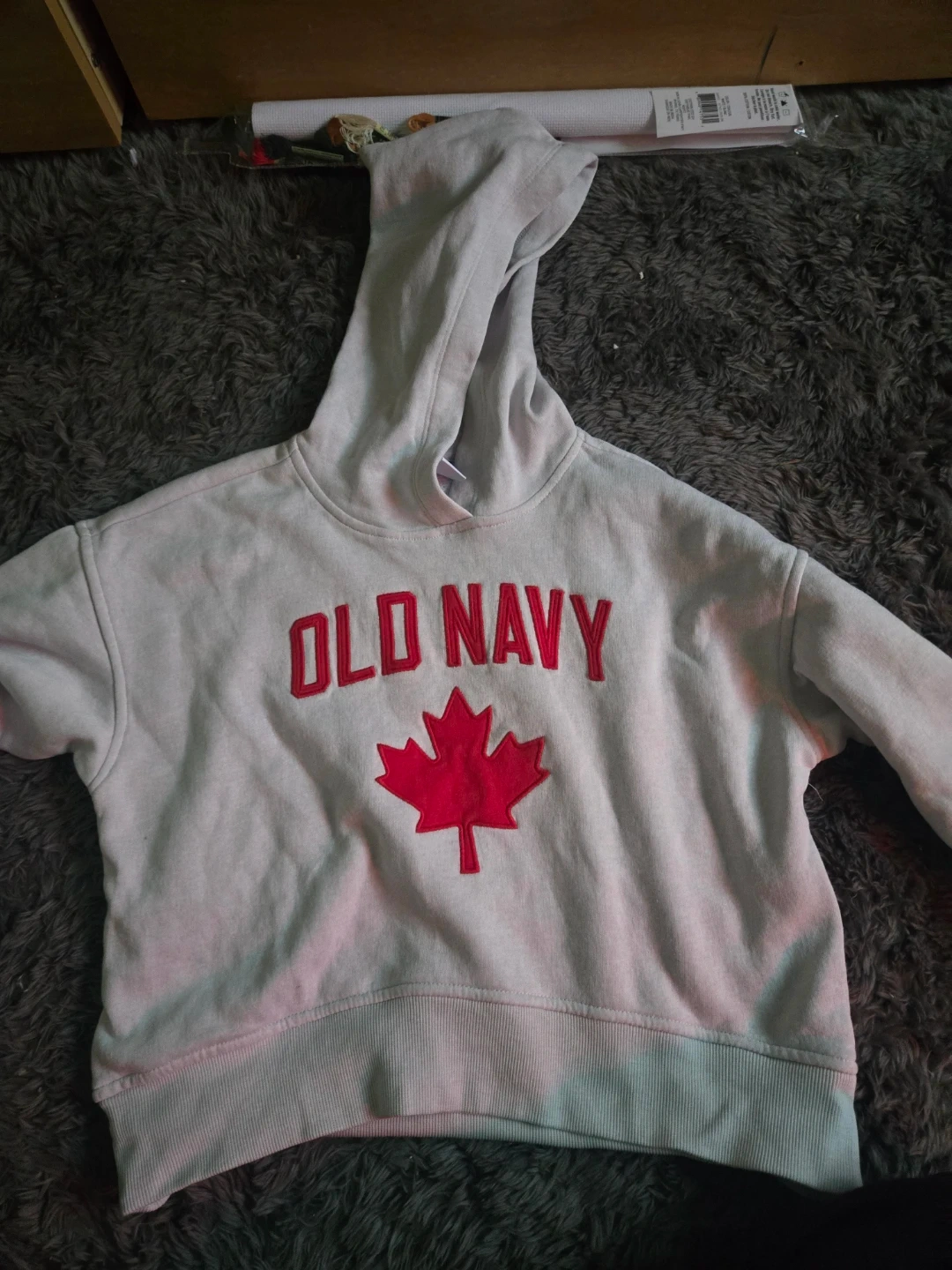 Bundle of four hoodies and sweatshirts. Includes Old Navy branded items with graphics like NYC, a Canadian maple leaf, and '1994'. Mostly grey, coral, and tan colours. Made of cotton blend. For girls aged 6-12
