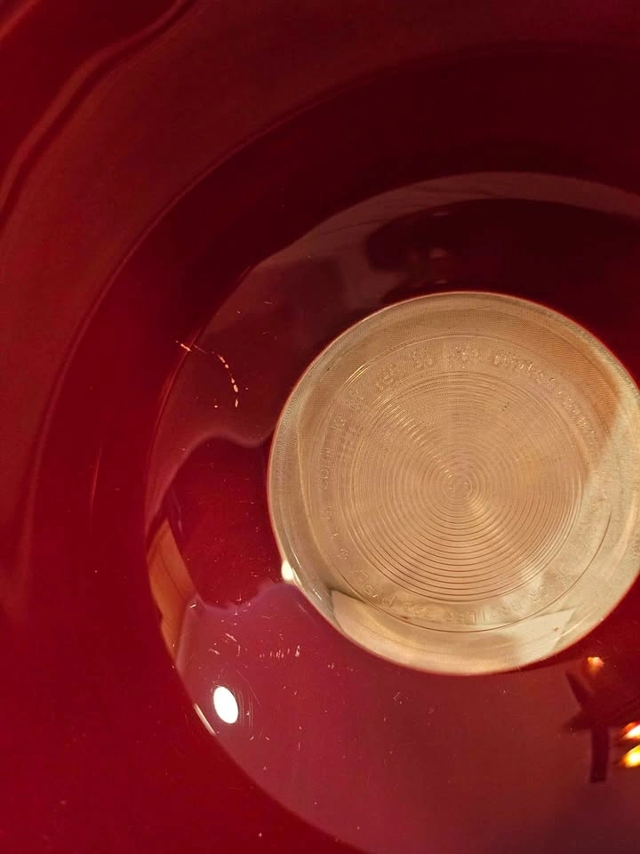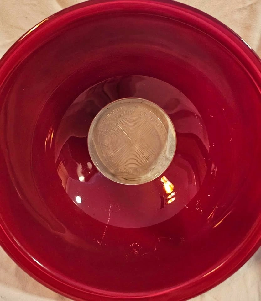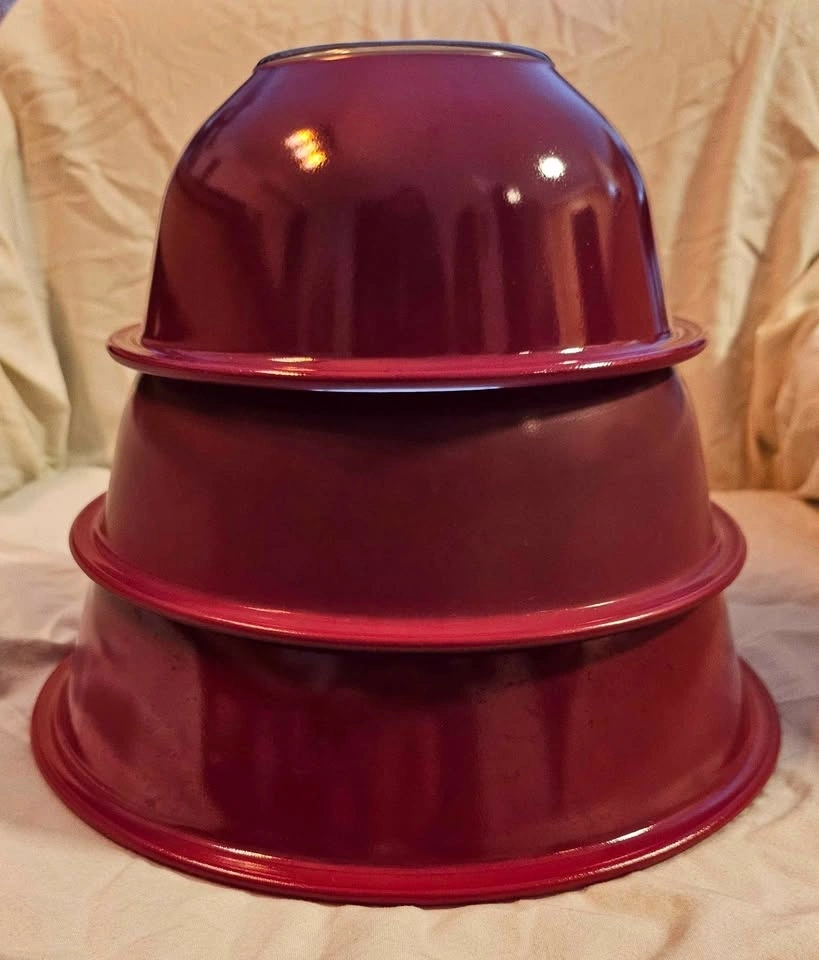 These mixing bowls are from the '80s. There are no chips or cracks. The red color was applied to the outside of the bowl. Please view the photos to see some scratches to the red applique, mainly on the largest bowl. This type of wear is very typical for these bowls. These bowls were used for display only. When stacked, no flaws to the red applique are noticeable. The strong color of these bowls makes for a dramatic display in a white, grey, or black kitchen. Pictures are ordered from the smallest to largest bowl. Largest bowl is 10" diameter, middle bowl is 8 1/4" diameter, and the smallest bowl is 7" diameter. Height when stacked is 4".