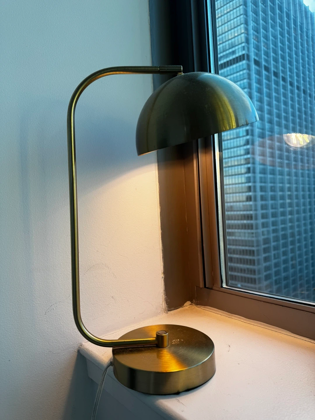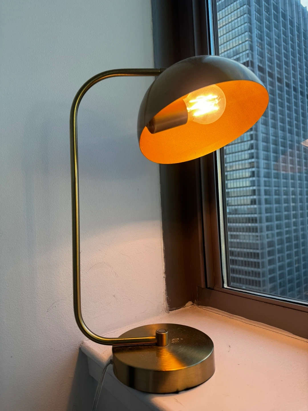 Here's a stylish gold metal desk lamp that would look great in any room! It's in excellent condition and provides a warm, inviting light. Perfect for a desk, nightstand, or side table