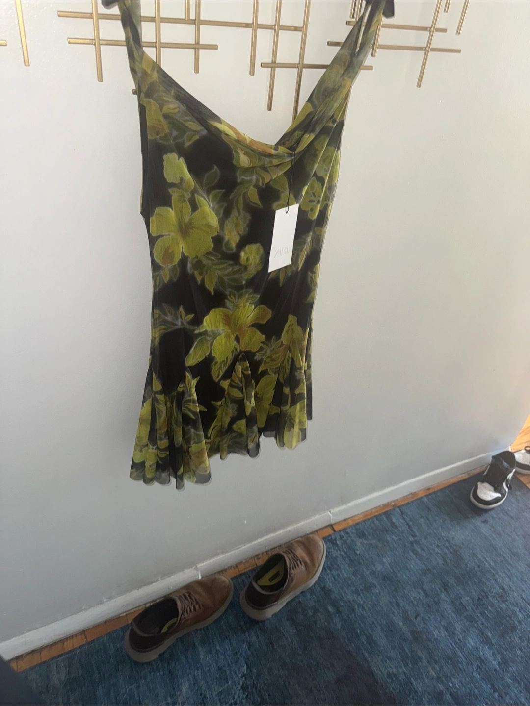 This is a ZARA mesh mini dress with a floral print. It features a cowl neckline and a flounced hem. The material is a lightweight mesh, perfect for layering or wearing on its own.