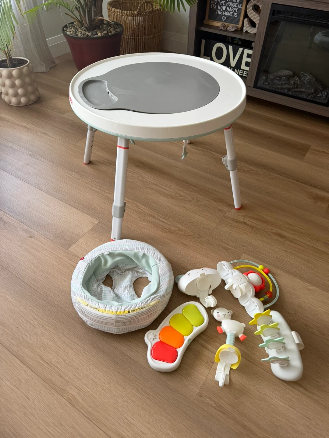 This Skip Hop activity centre grows with your child through three stages, supporting up to 25 lbs. It includes various engaging toys and a seat that allows for different play modes. It's also designed to pair with kid chairs for a table-like experience.