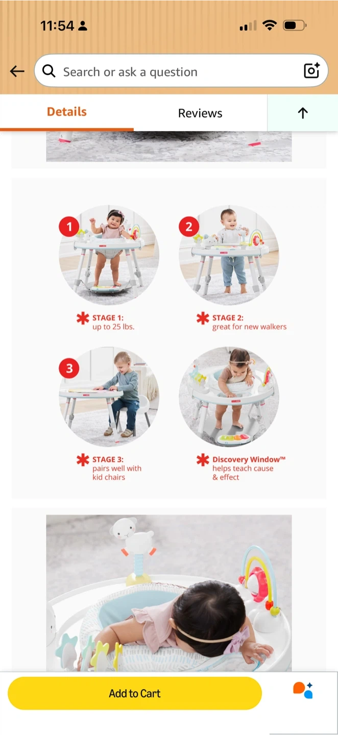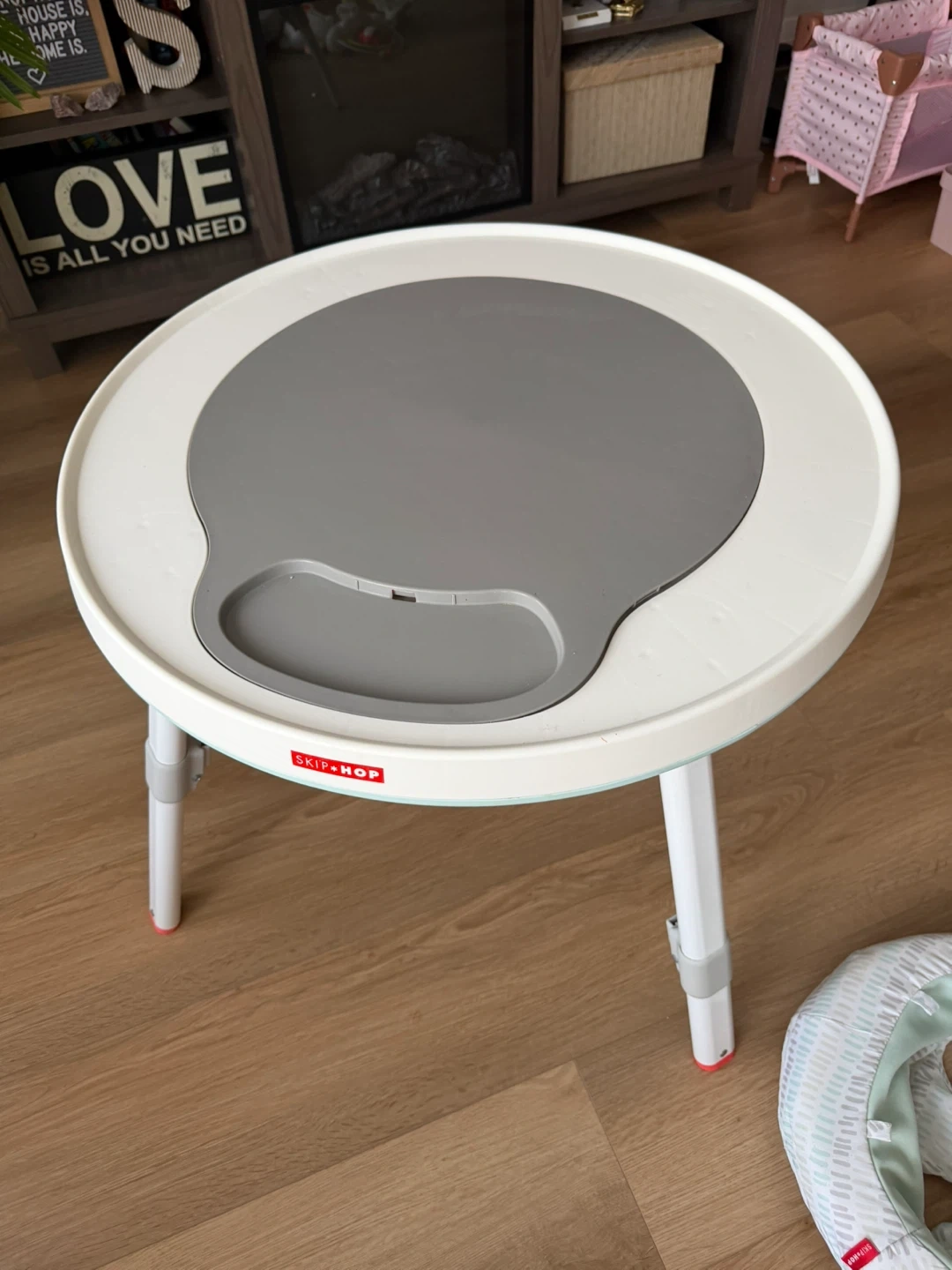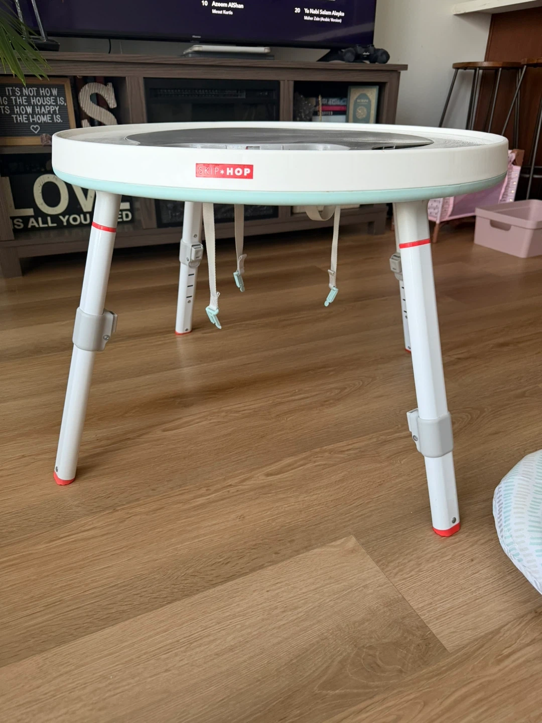 This Skip Hop activity centre grows with your child through three stages, supporting up to 25 lbs. It includes various engaging toys and a seat that allows for different play modes. It's also designed to pair with kid chairs for a table-like experience.