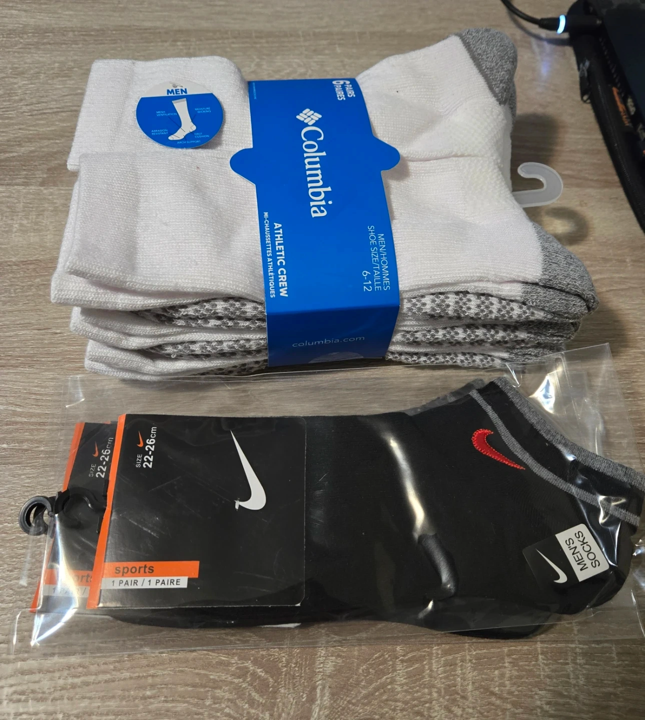 6 Brand new Columbia socks + 3 brand new Nike socks.