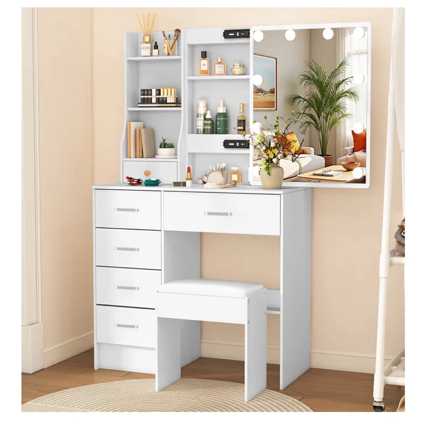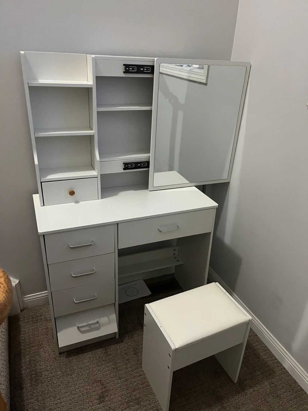 This white vanity set features a lighted mirror with 3 color modes and adjustable brightness. It includes a storage cabinet with shelves and drawers, along with a matching stool. It’s new and assembled, one drawer slide is missing