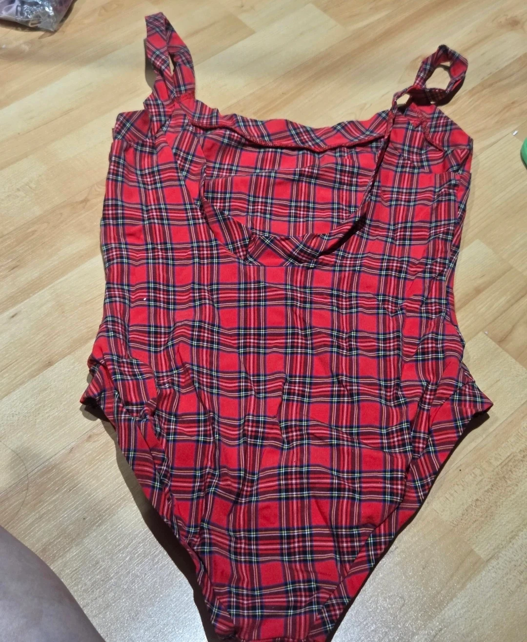 This is an Escada Sport Swim suit with a red plaid pattern. It's made from 92% polyamide and 8% elastane. Size is 36. It features a hygienic protection liner. Brand new.