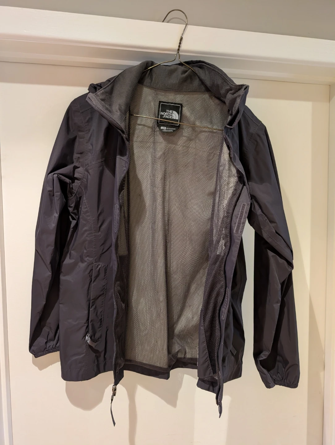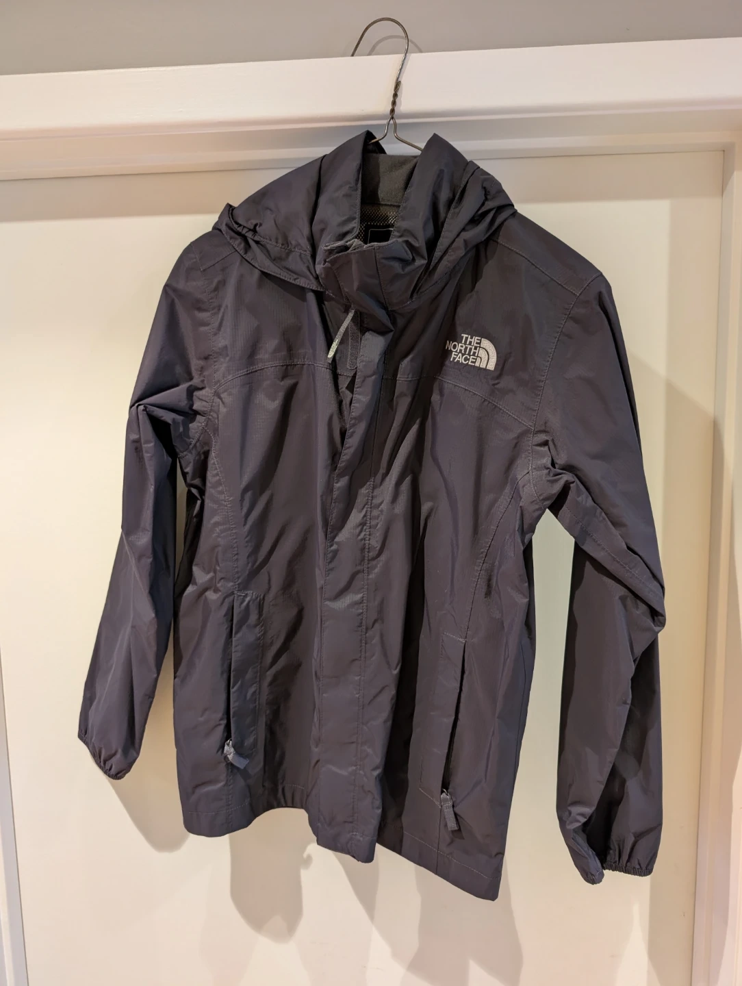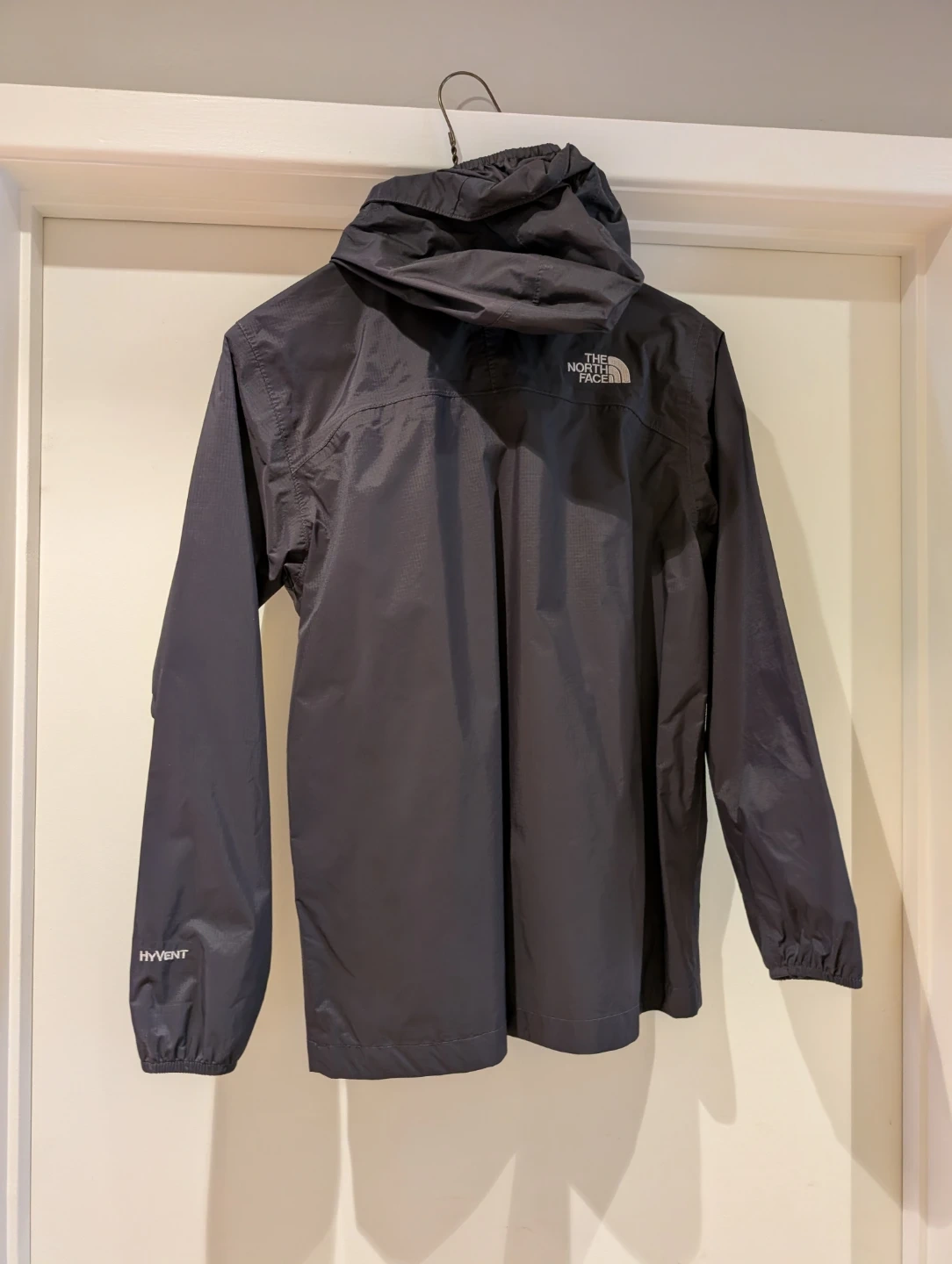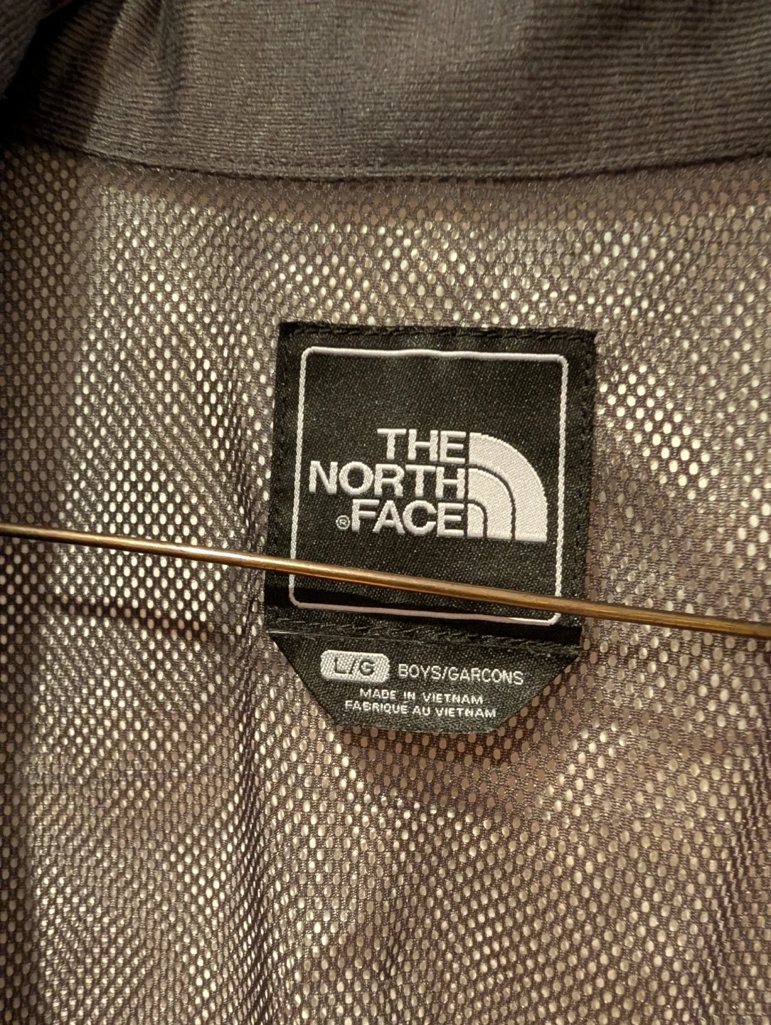 The North Face boys' black rain jacket in size L/G. The shell is made of 100% nylon, and the body and sleeve/hood lining are also 100% nylon. There is an interior mesh lining.