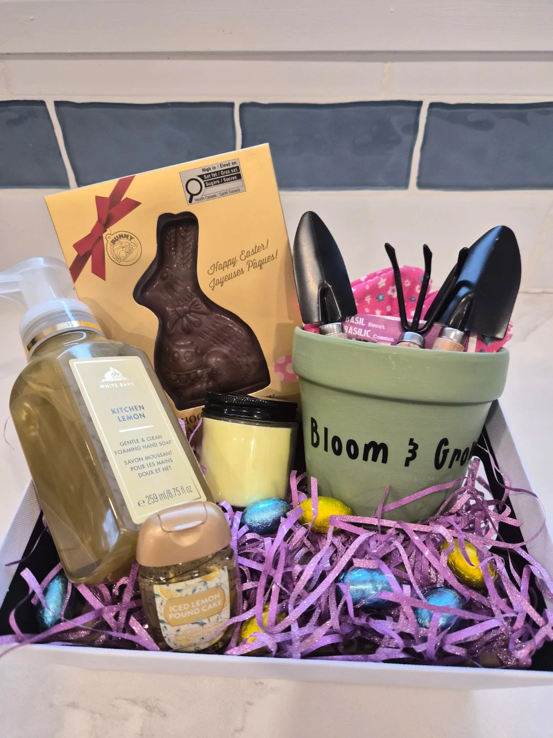 A beautiful spring gift basket perfect for Easter or any garden lover. This basket includes a hand-painted β€œBloom & Grow” flower pot with mini gardening tools, a handmade lemon lavender-scented candle, lemon hand soap, hand sanitizer, chocolate bunny, and festive Easter treats. A thoughtful gift for anyone who loves gardening, fresh spring scents, and a little seasonal sweetness. πŸŒ·πŸ°πŸ‹ Can be personalized upon request. Just need age and gender. Pickup before Easter Sunday.