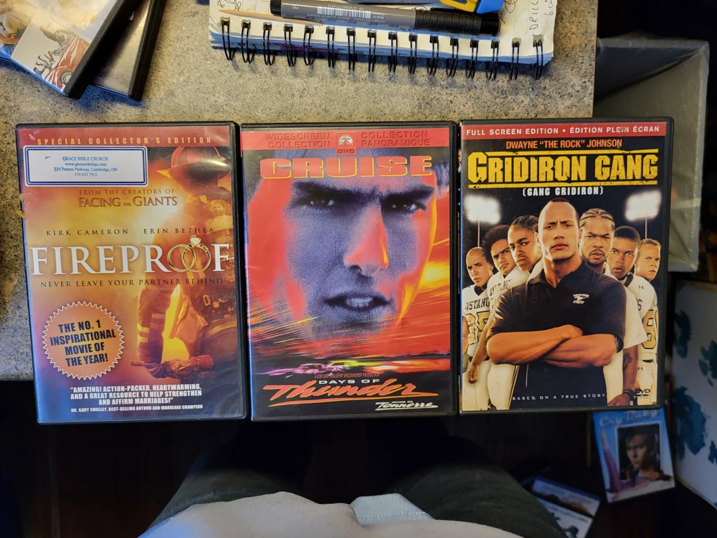 Three DVDs: Fireproof (Special Collector's Edition), Days of Thunder (Widescreen Collection), and Gridiron Gang (Full Screen Edition). These films offer drama and inspiration.