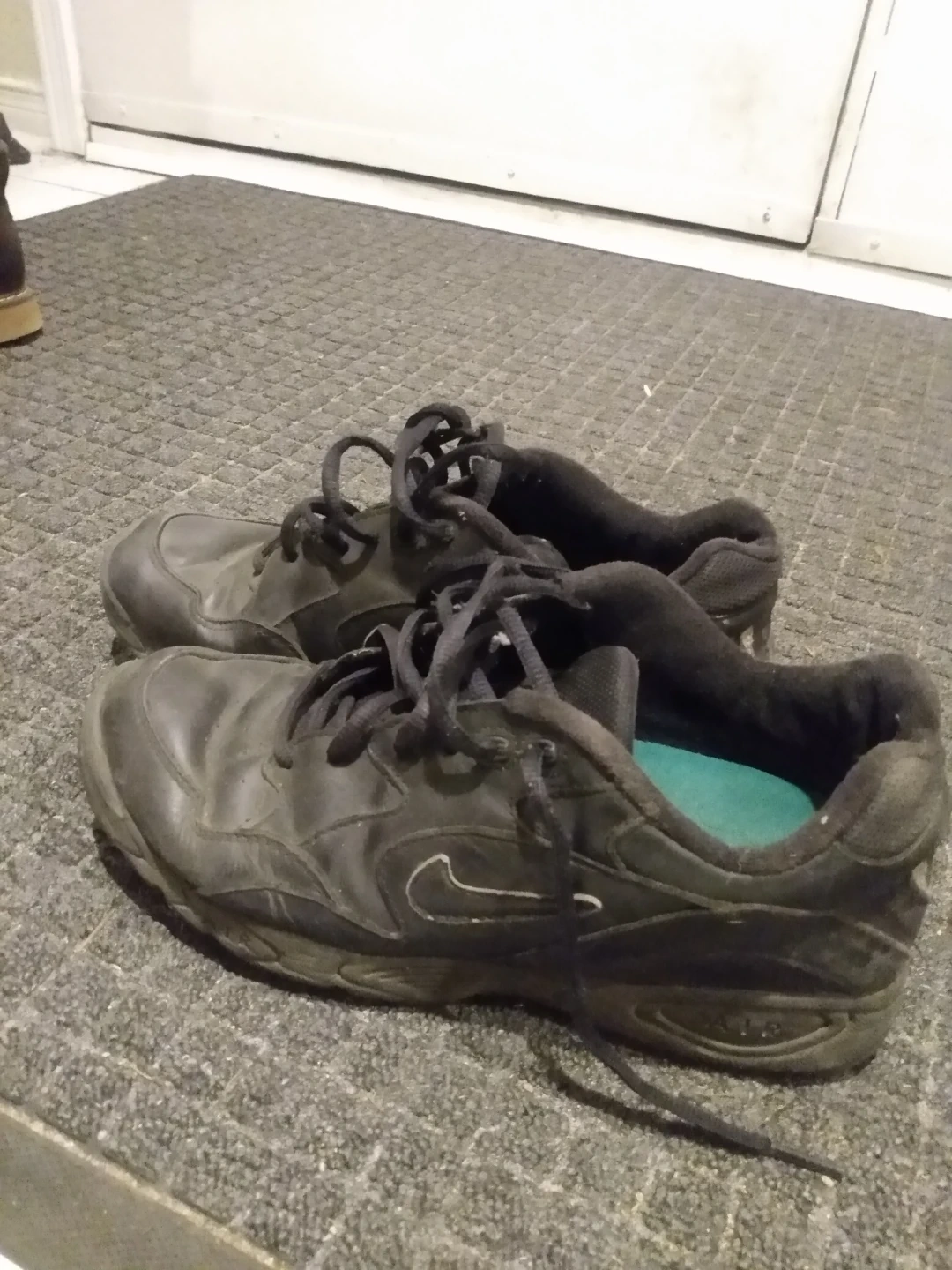 These are black Nike Air running shoes. They're made of leather and mesh. They feature a lace-up closure for a secure fit. These shoes are suitable for running or everyday wear.