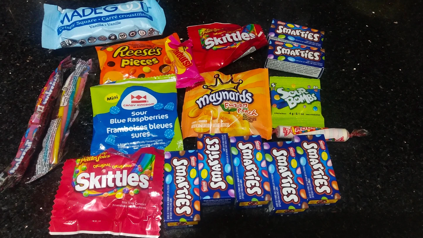 This lot includes a variety of popular Canadian candies. You'll find Smarties, original Skittles, Reese's Pieces, Maynards Fuzzy Peach, and Candy Kingdom Sour Blue Raspberries. It's a great mix for any sweet tooth!