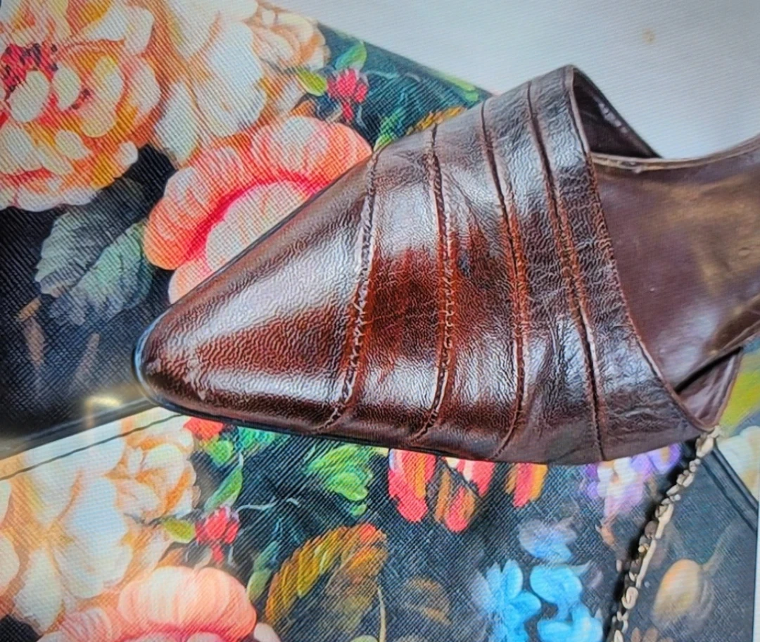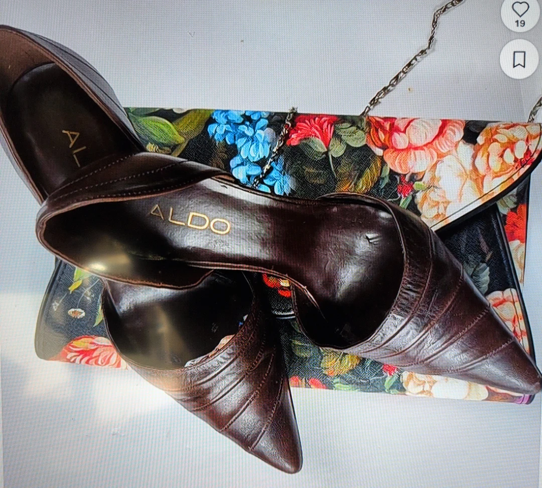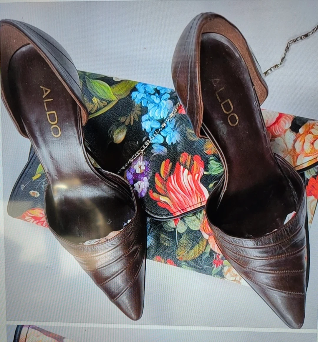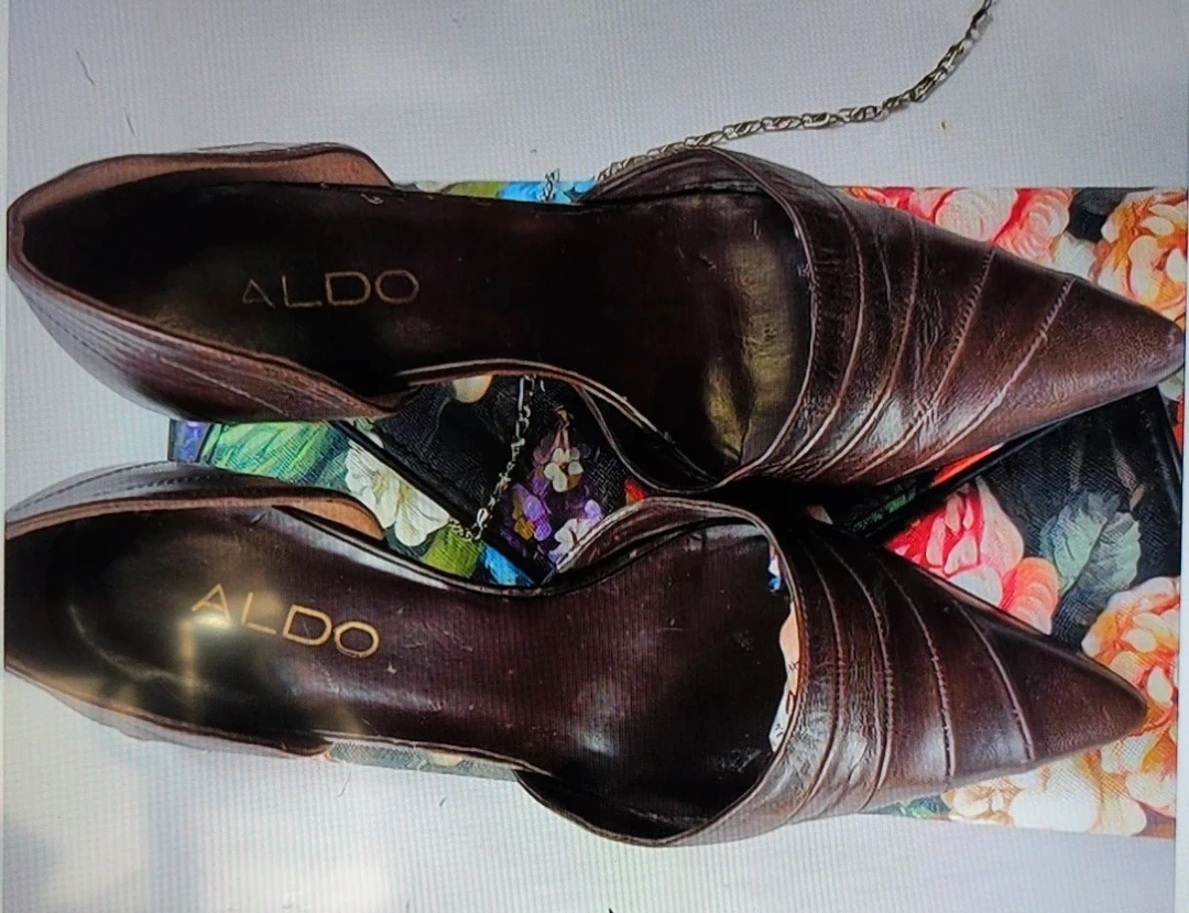 These are ALDO brown leather heels. They have a pointed toe and a d'Orsay cut. The heel height is approximately 3 inches. They're perfect for dressing up an outfit!