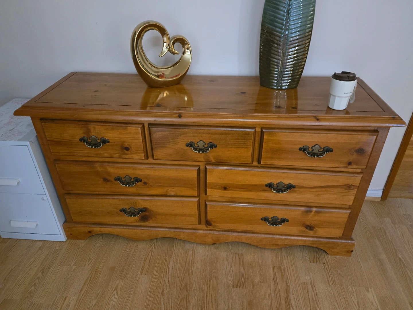 This is a solid wood dresser with seven drawers for ample storage. It's made of pine and features antique-style hardware. This dresser would be a great addition to any bedroom for organizing clothes and personal items.
