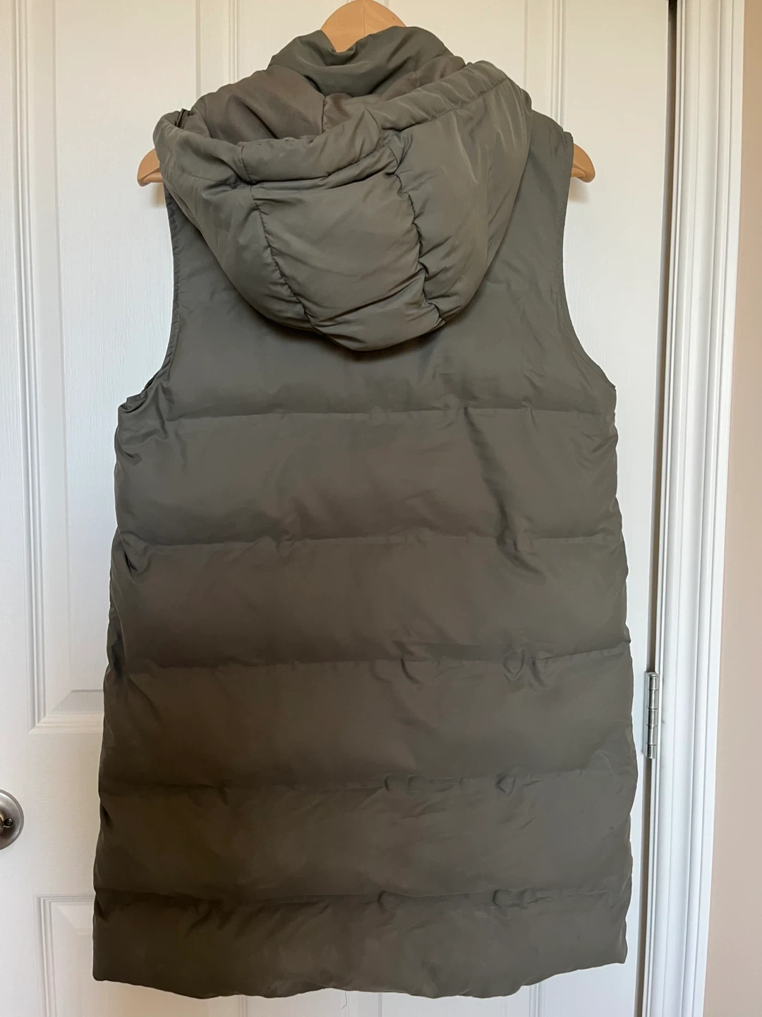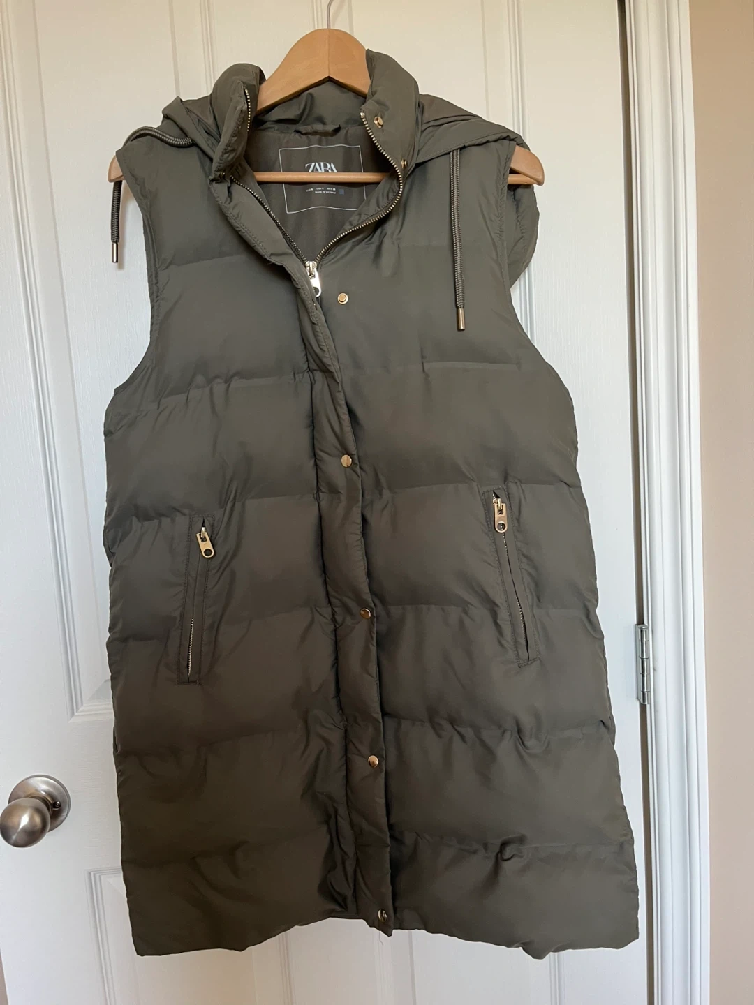 Olive green puffer vest from ZARA. It has a hood and gold-tone zipper & snaps details. Perfect for layering on cooler days!