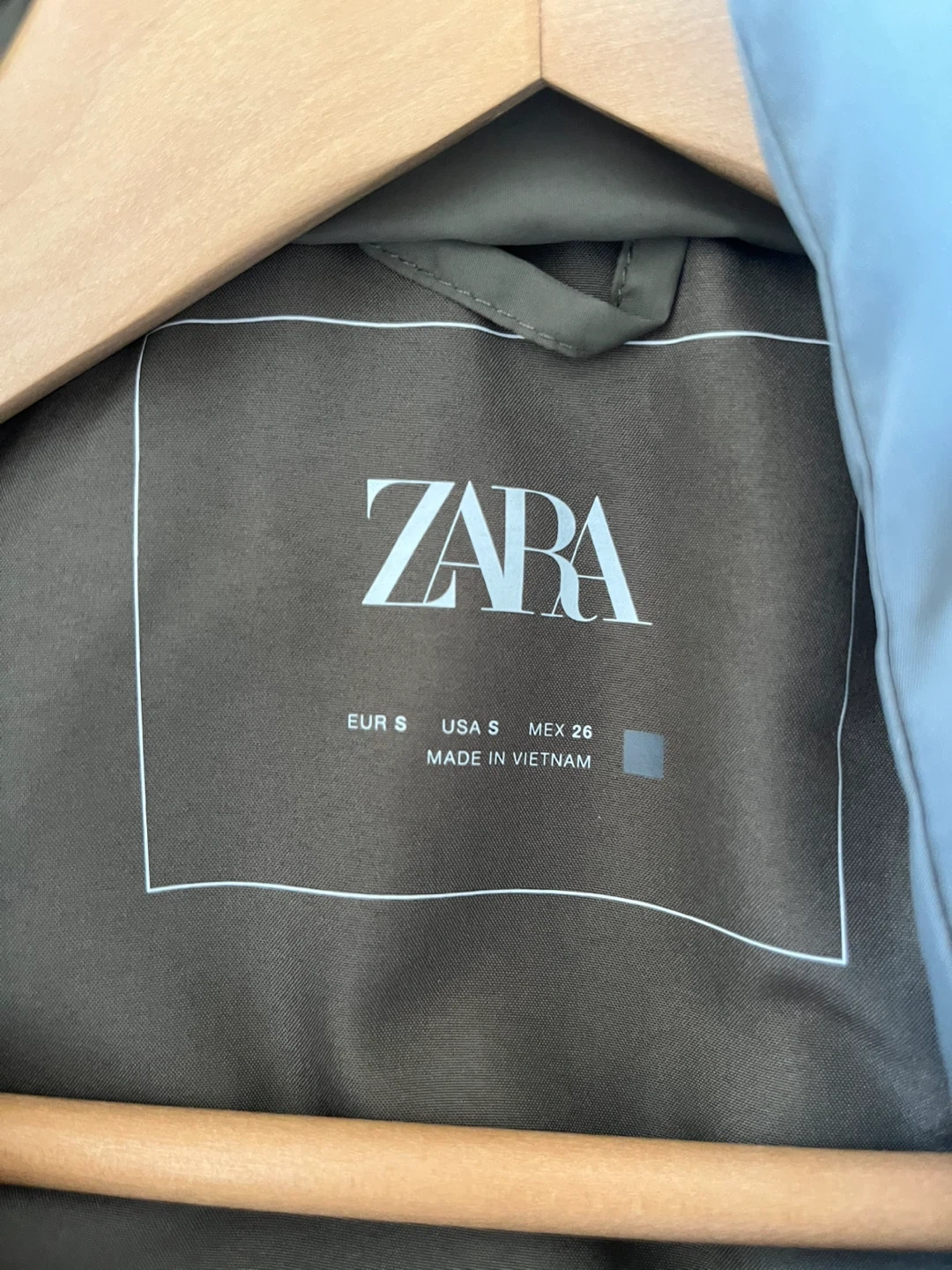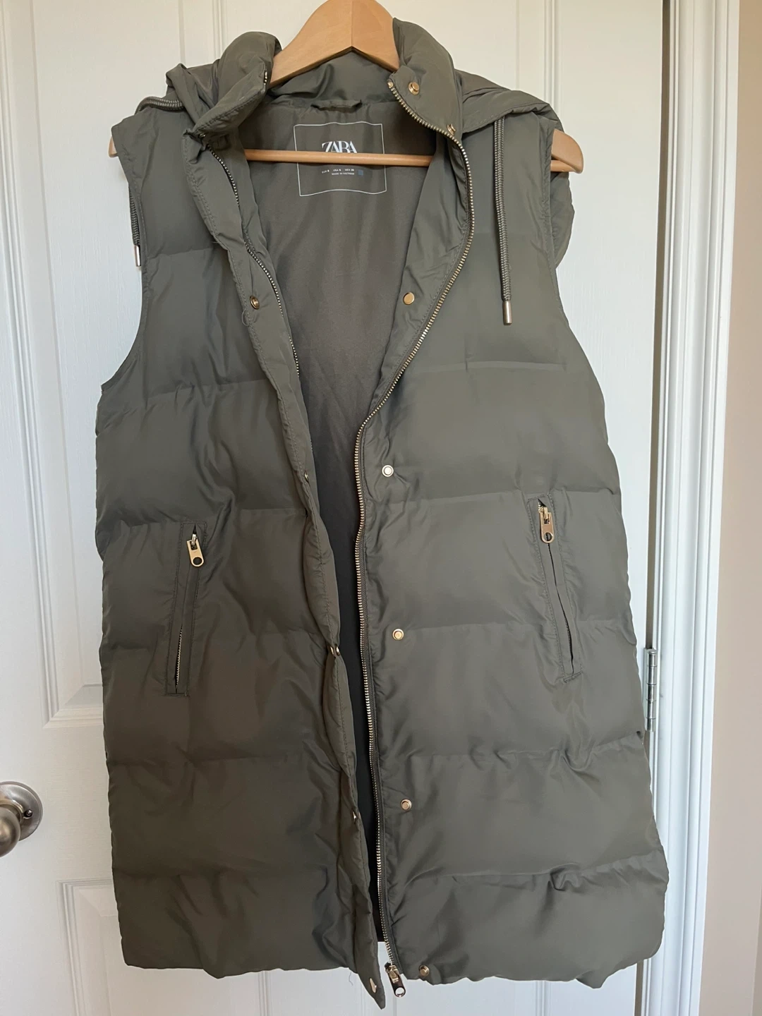 Olive green puffer vest from ZARA. It has a hood and gold-tone zipper & snaps details. Perfect for layering on cooler days!