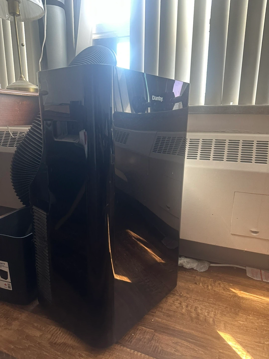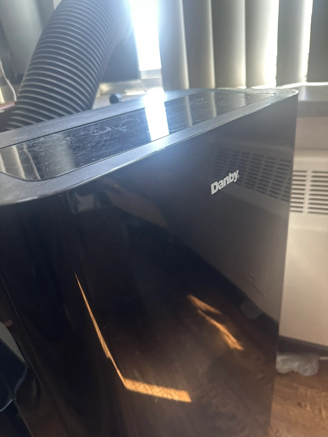Danby portable air conditioner with exhaust hose. Black glossy finish. This unit is great for cooling down smaller spaces.