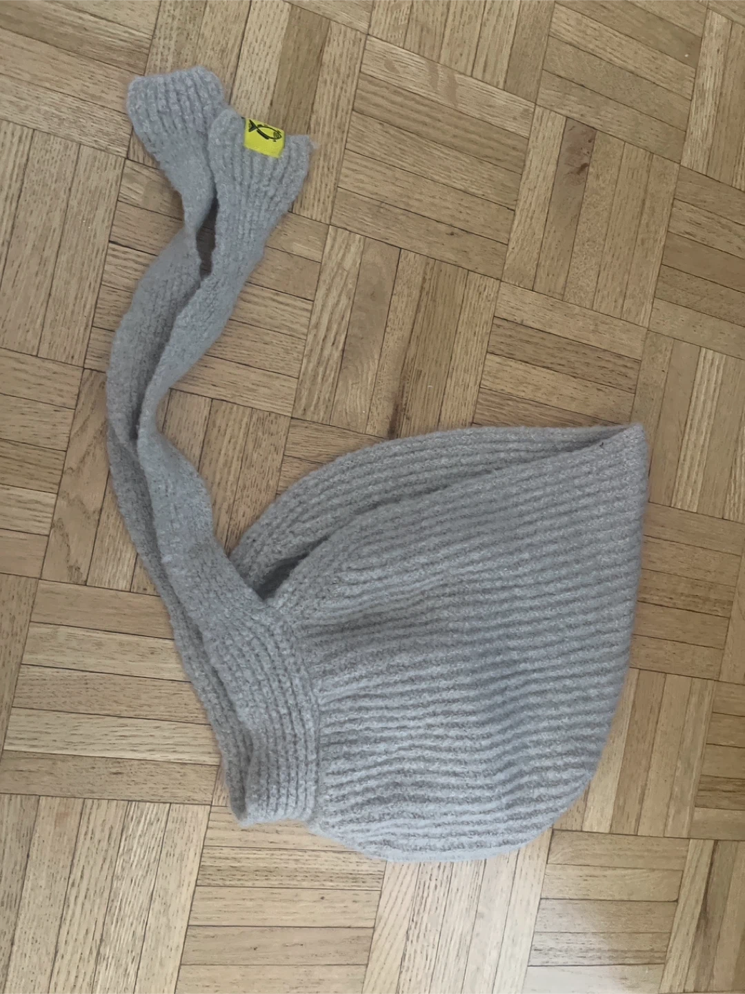 This is a ribbed knit balaclava or hood. It features a yellow tag with a fish logo. Made from a soft, stretchy material, it's great for keeping warm.