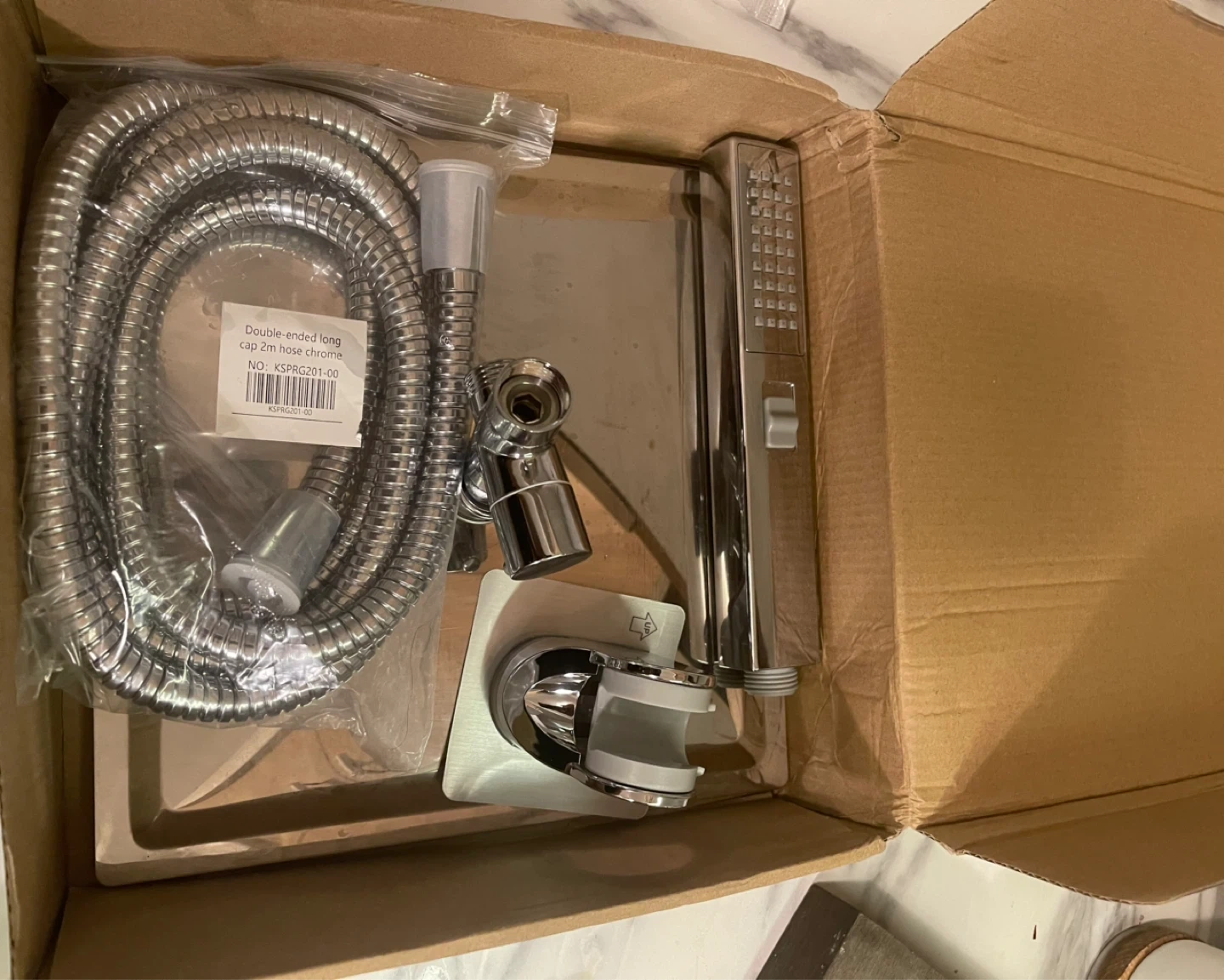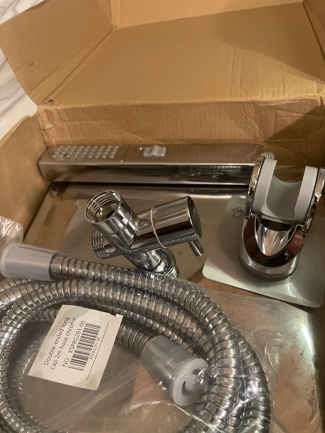 This is a 10-inch square rainfall shower head with a handheld sprayer. It's made of stainless steel and comes with a diverter, hose, and adhesive bracket.