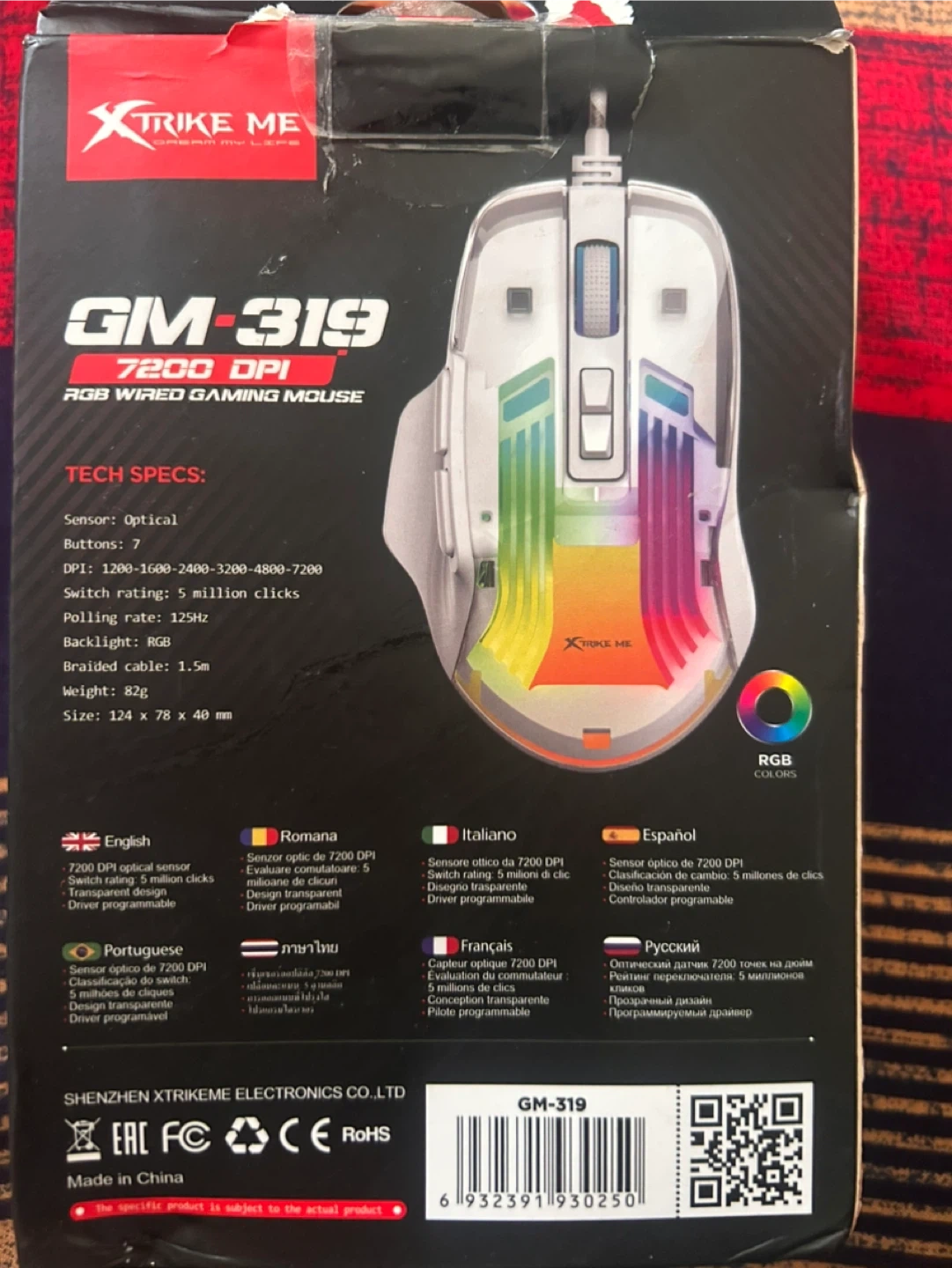 Xtrike Me GM-319 wired gaming mouse with RGB lighting. It has 7 buttons and 7200 DPI optical sensor. Polling rate is 125Hz and it's compatible with Windows. Weight is 82g. This mouse is great for gaming sessions!