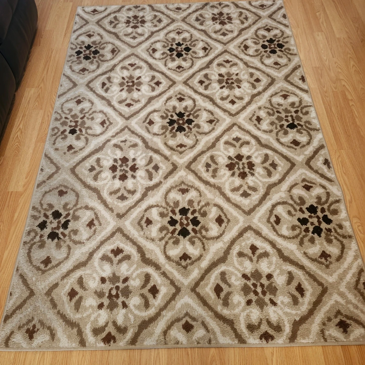 This area rug features a timeless geometric quatrefoil pattern in neutral tones of beige, brown, and cream. It's made from a soft, plush material suitable for living spaces. The neutral colour palette makes it easy to match with various decor styles. Used but no cuts, rips or stains. Paid $140 new. Firm $10.00.