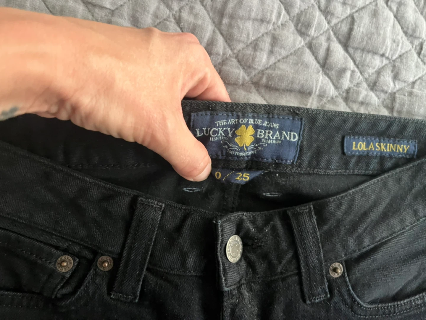 Selling a pair of Lucky Brand Lola Skinny Jeans in size 0/25. They're in great condition and ready for a new home! The black Jean is super versatile, and they're comfy enough for everyday wear