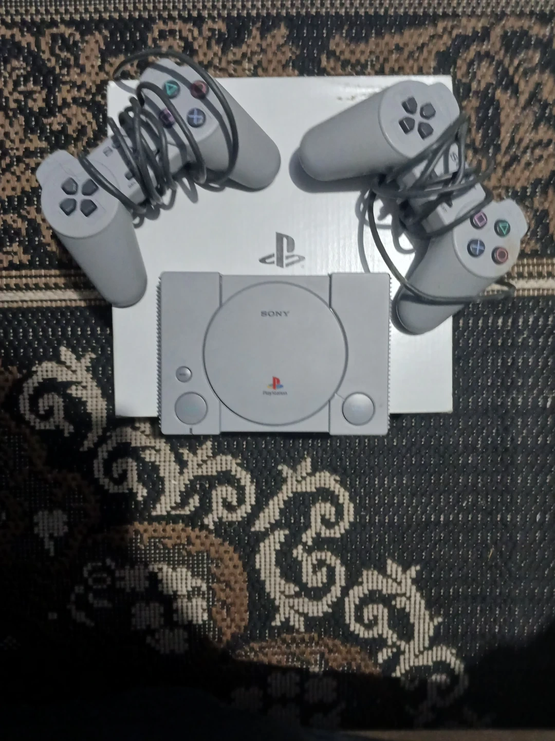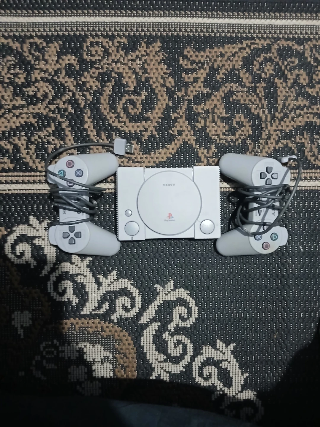 Original Sony PlayStation 1 console. It's a classic grey model and comes with two original controllers, ready for some retro gaming fun! This bundle includes the console and controllers, perfect for reliving some favourite gaming moments.