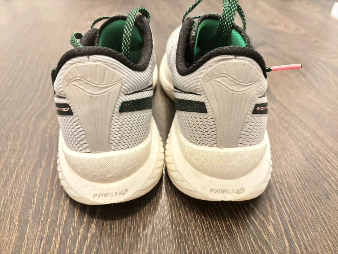 Light grey Saucony Endorphin 3 running shoes. Lightly used. Perfect for an 8 1/2 foot. These shoes are suitable for daily runs or training sessions.