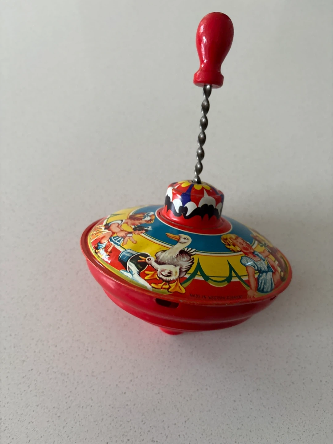 Vintage- 1970’s. This is a colourful tin litho spinning top with playful illustrations. It features children, a goose, a rooster, and a rabbit. Made of tin and plastic for the handle.